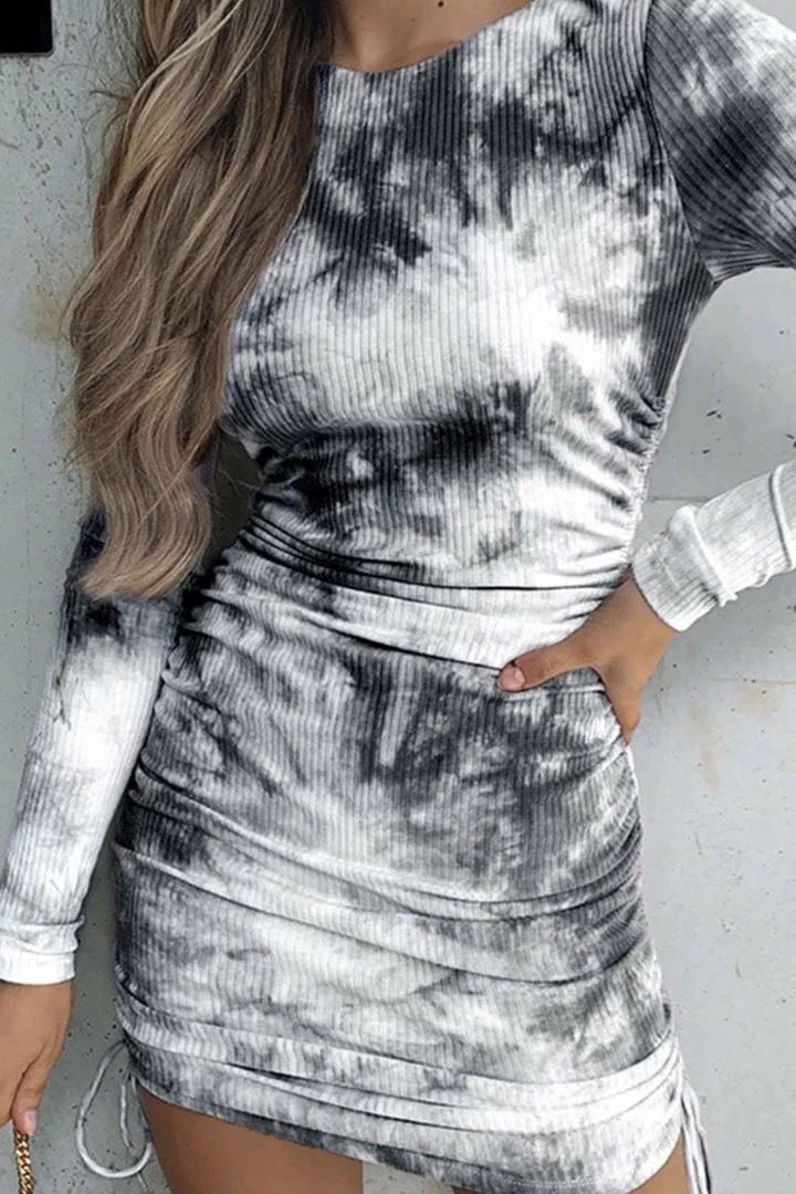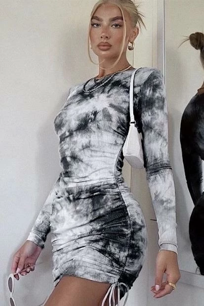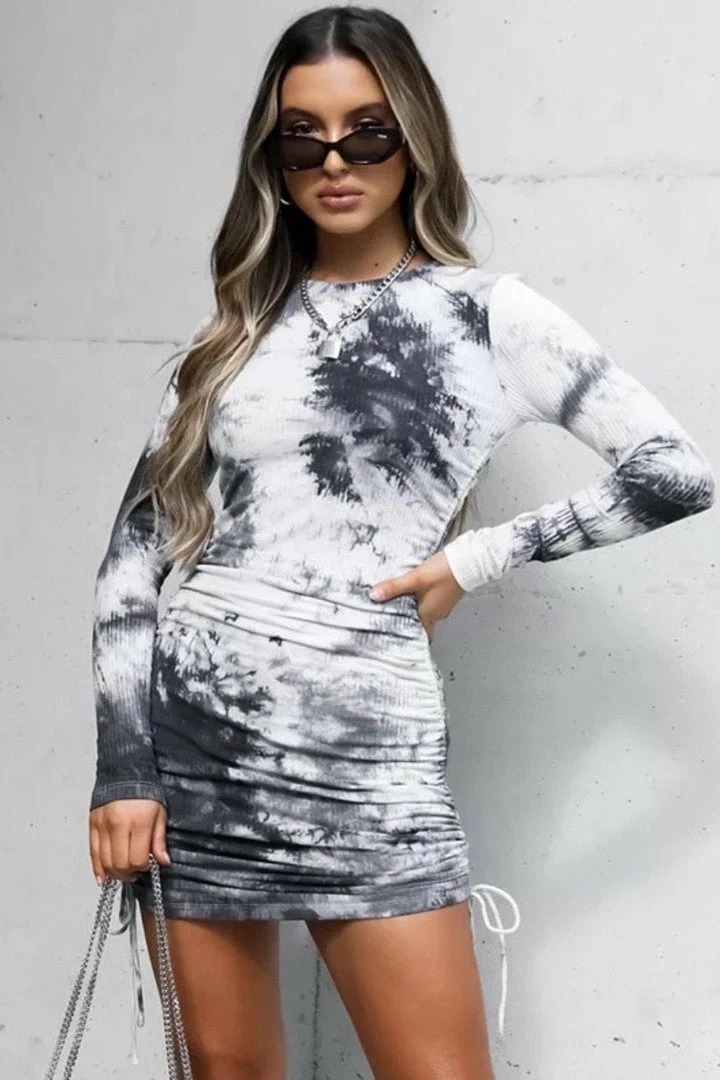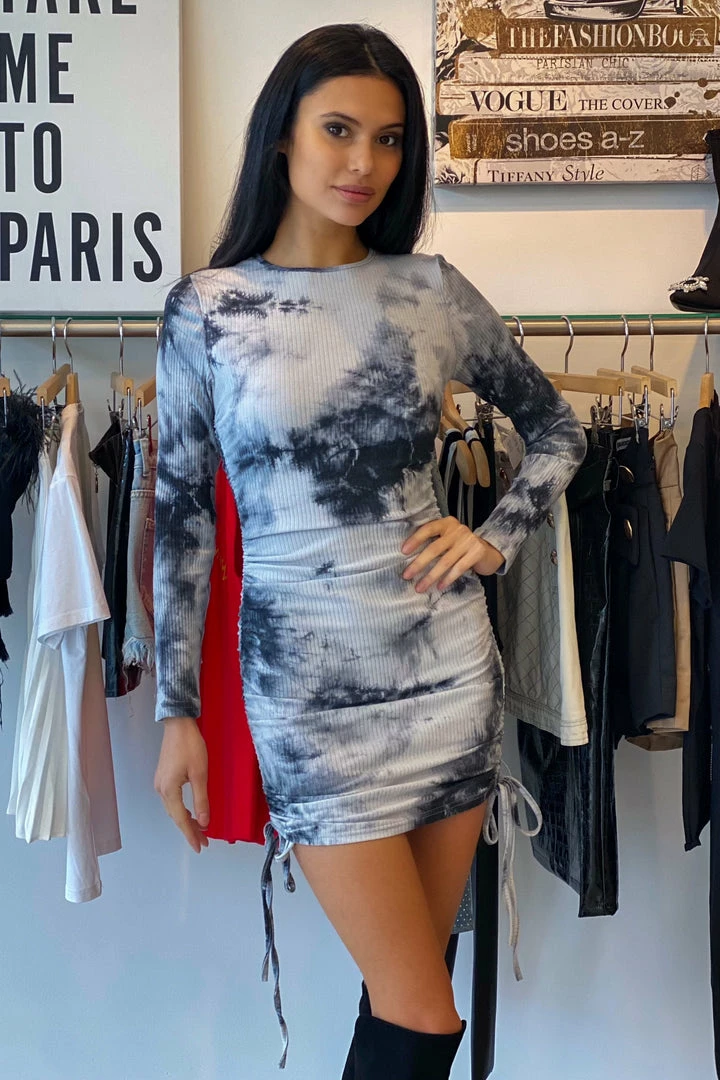 Nail the tie dye trend with this cute mini! Featuring a tie dye printed material, long sleeves, ruched detailing, bodycon fit, and a mini length.