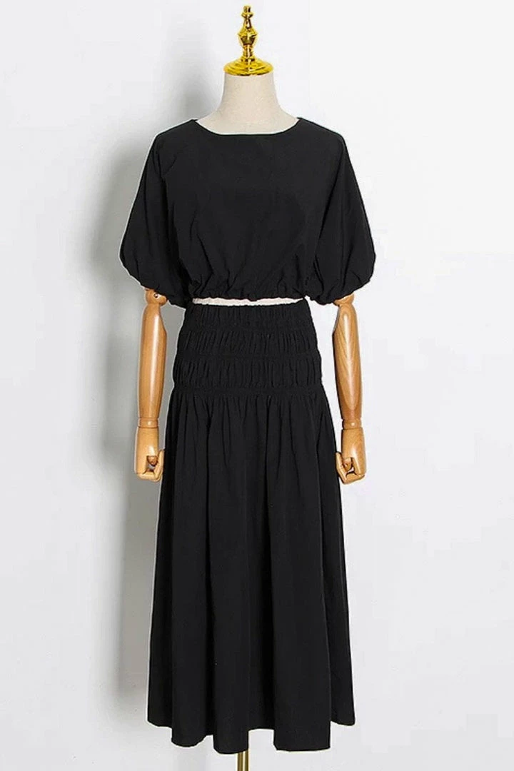 Looking for an effortless, chic look this season? Look no further! This two piece set features a cropped short sleeve top with a matching high-waisted midi skirt. Pair with sandals and a wide-brim hat for a gorgeous summertime look.