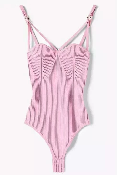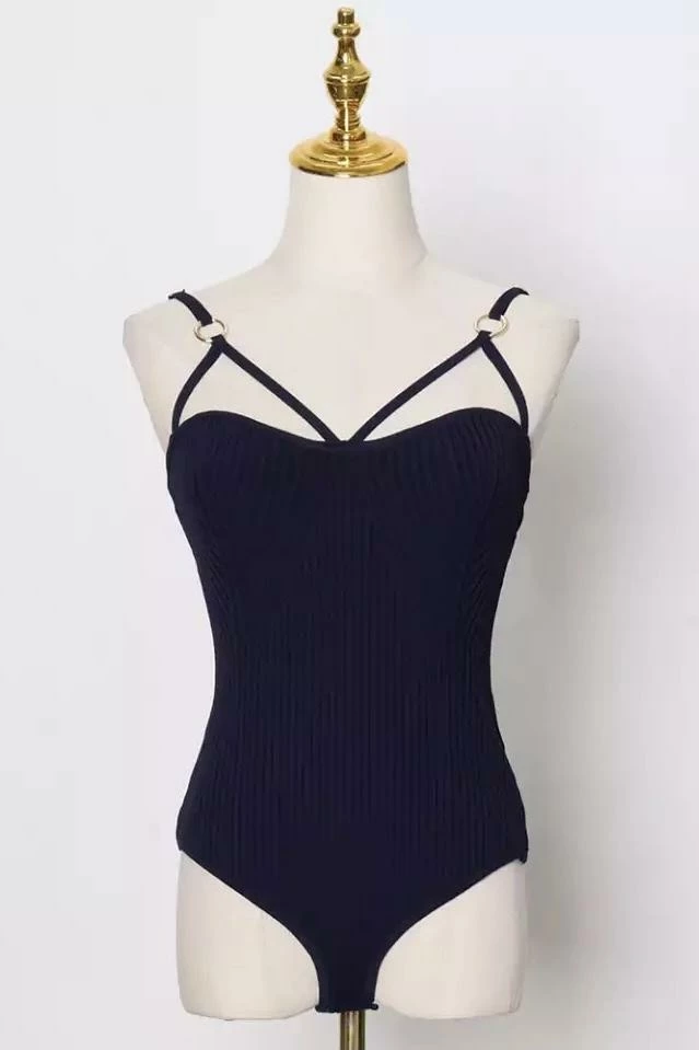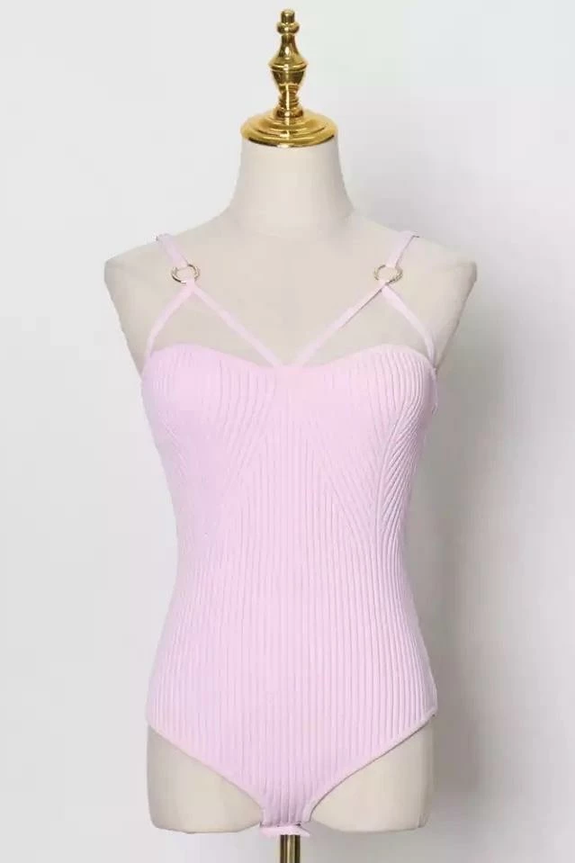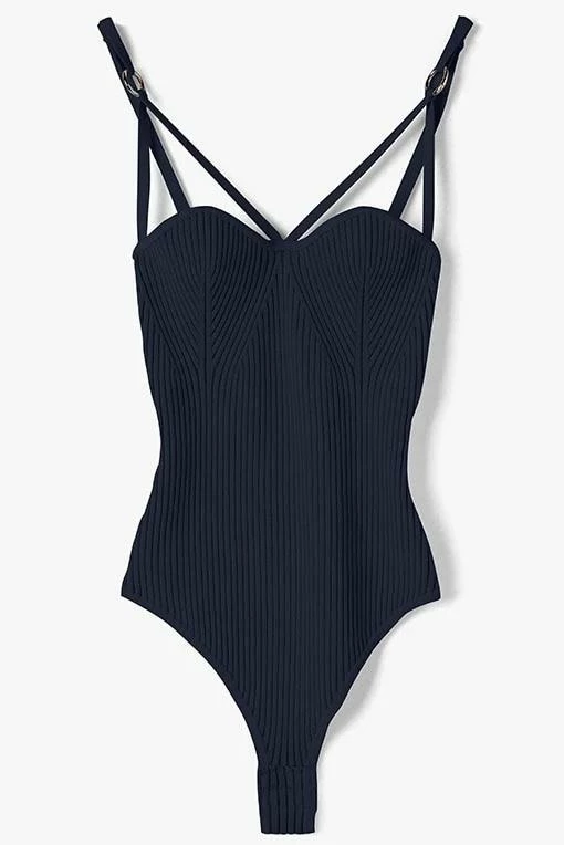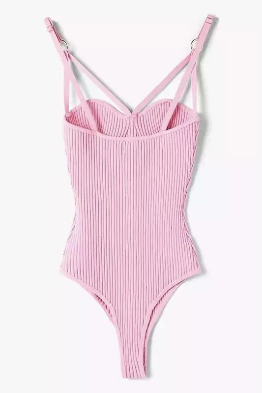 Go basic in style! This bodysuit thong features a knit material, thin double straps that cross over the breast, and gold hardware on the straps. Pair with jeans and a leather jacket for an everyday Reve Doll style.