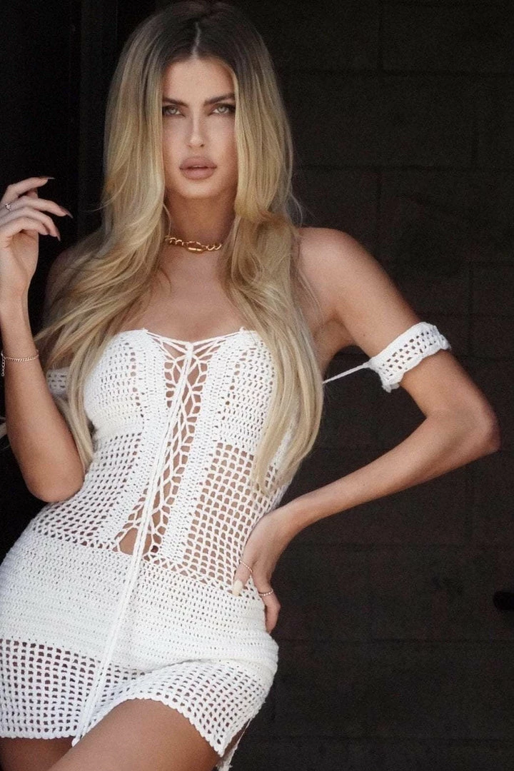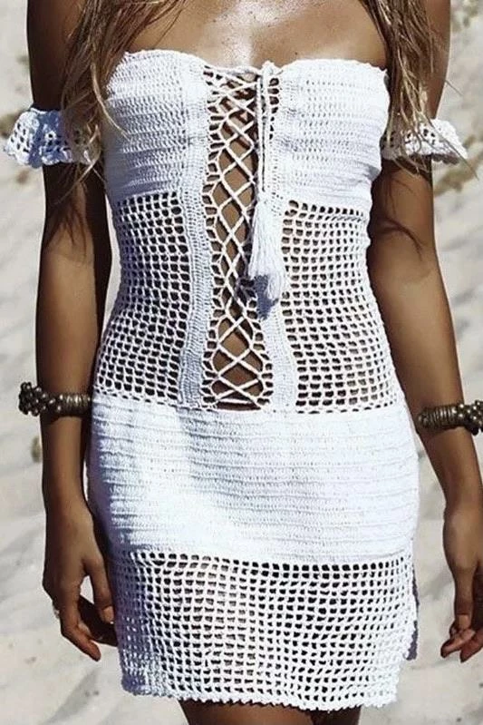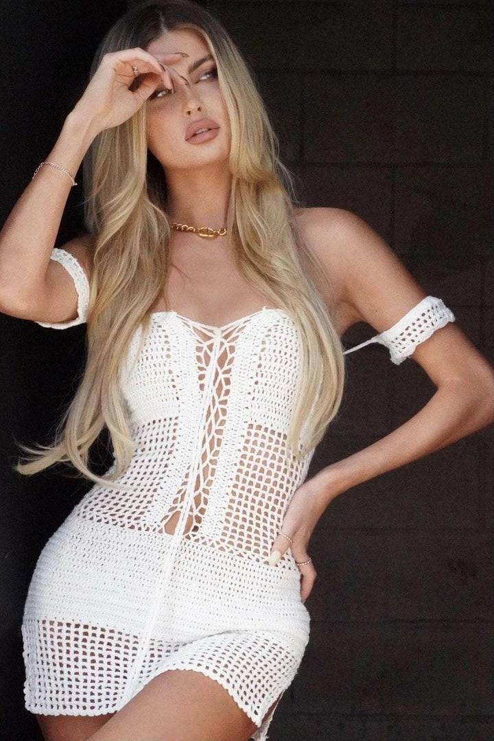 This Boho beauty features a handmade crotchet design with off the shoulder sleeves, a lace up front, and tassels to tie it off. Throw this on for your next beach trip or laying poolside with the girls.