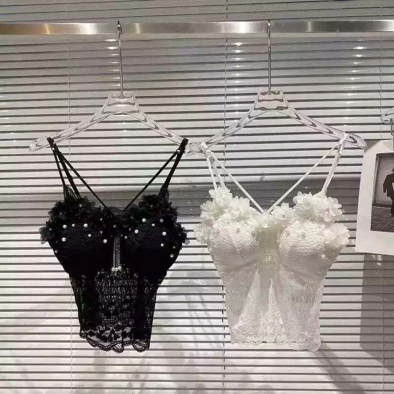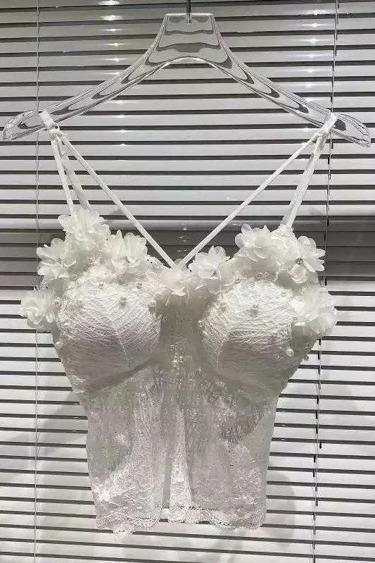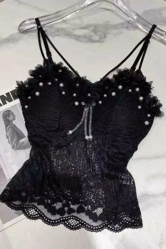 This top will have you looking dreamy dolls. Featuring thin straps that cross in the back, a ruffle along the bustling, pearl decoration, and a lace material. Pair with skinny jeans or a leather skirt and boots for your next date night out!