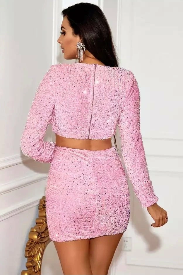 Party like a barbie doll this season! This two piece set features a cropped, long sleeve top with a fully sequined material and a matching high waisted skirt with an asymmetrical zipper and hem detail. Go all out and add our “Zenon” purse for your next celebration.
