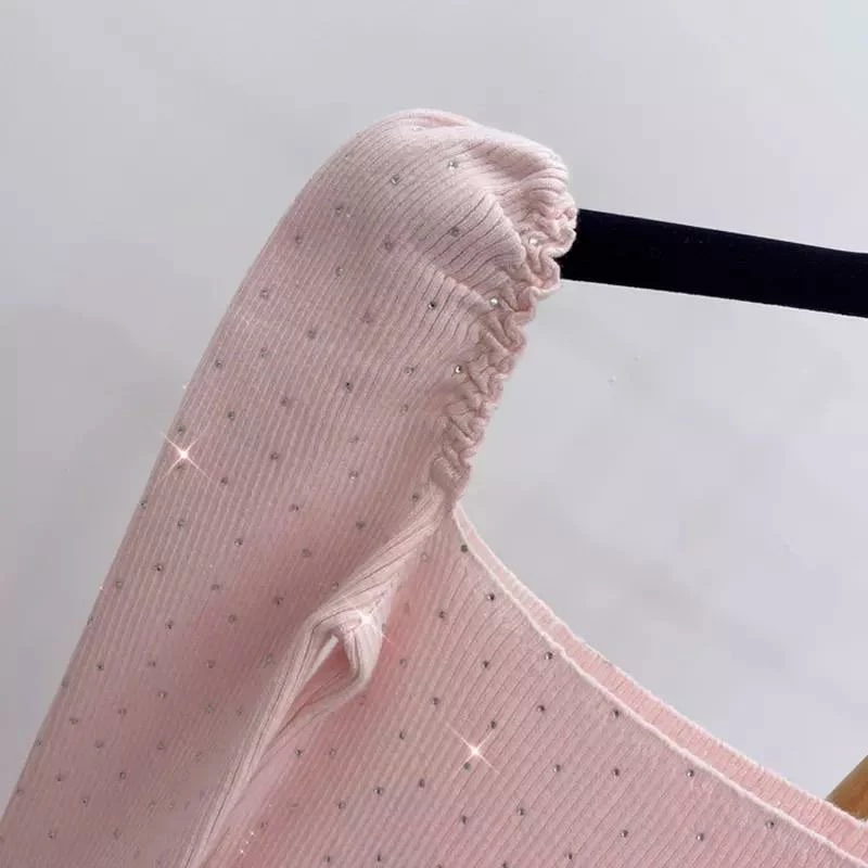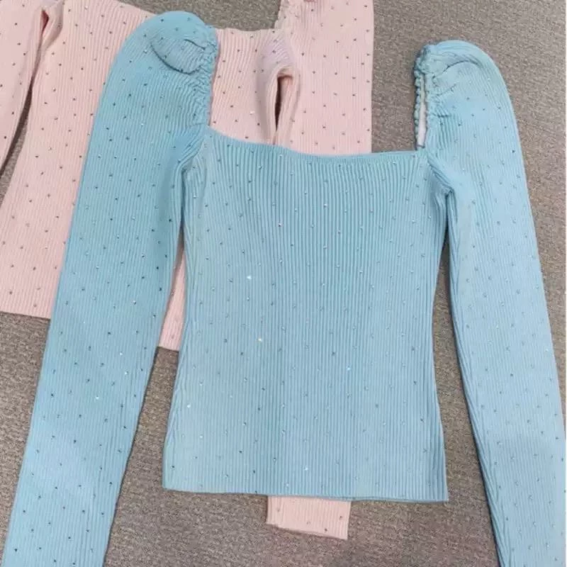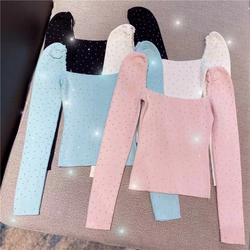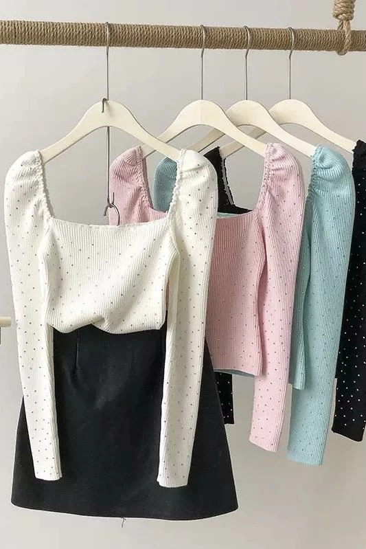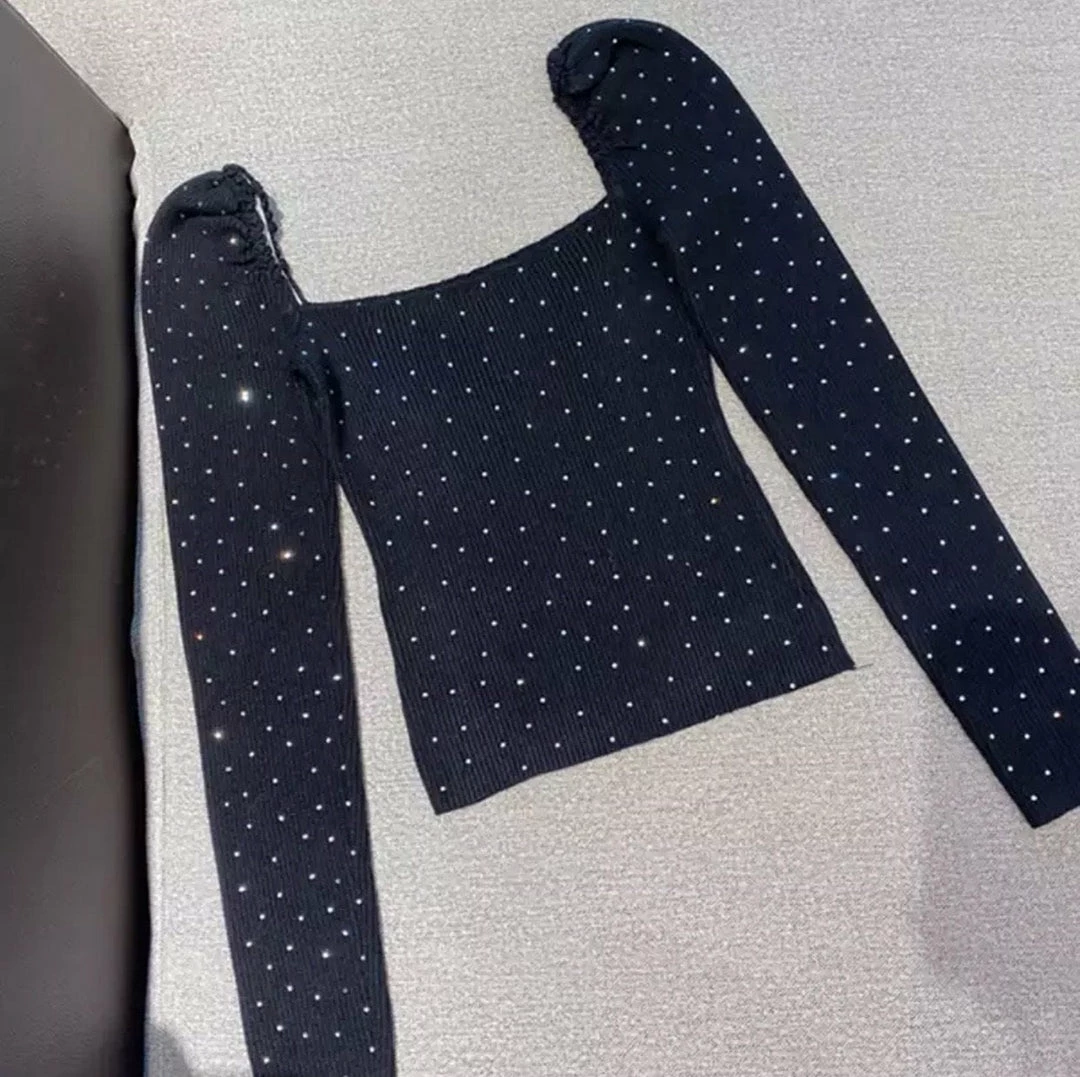 Glitz up your everyday style with this diamond decorated, square collar, puffy sleeved, knitted sweater top! Wear this with light wash jeans and a pair of strappy heels for a trendy daytime look!