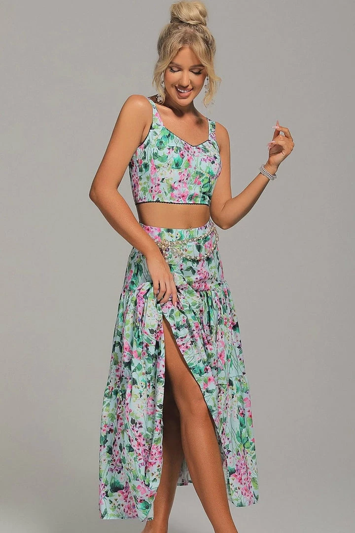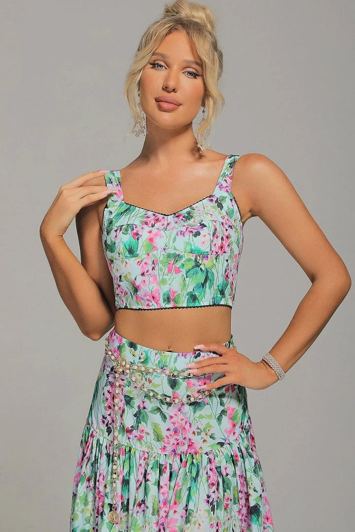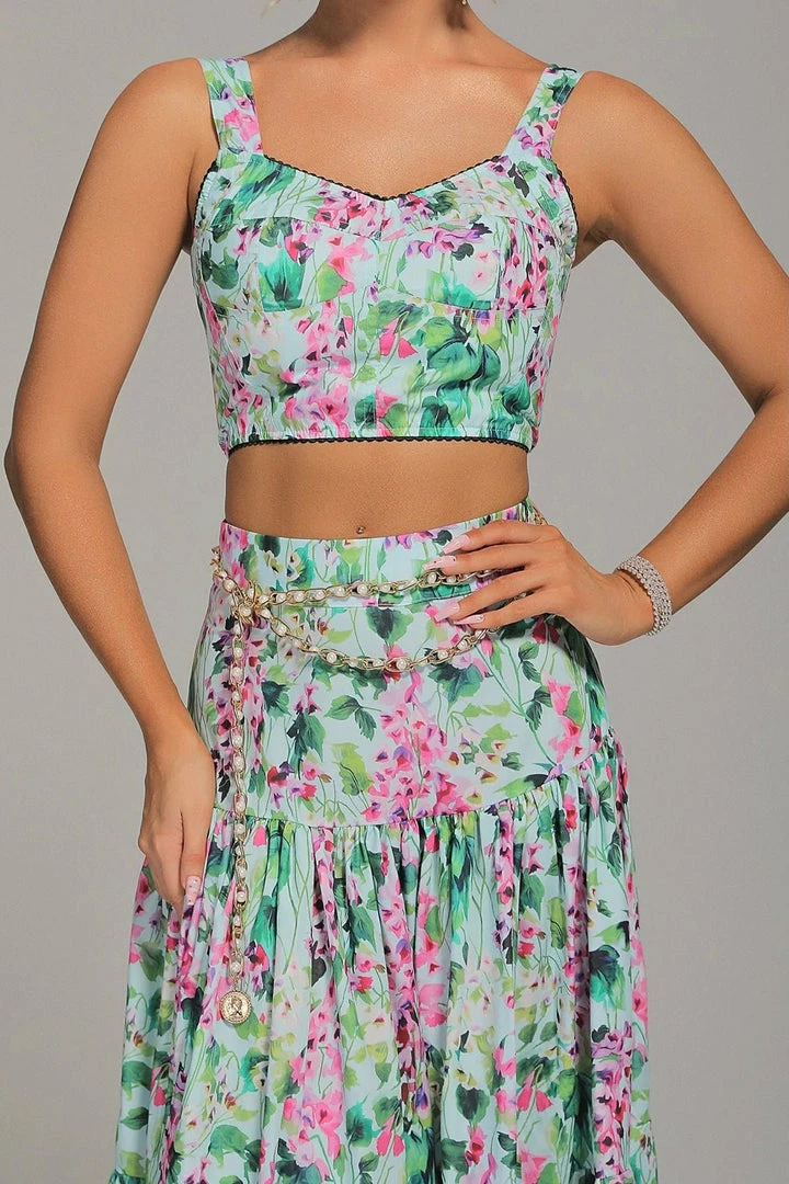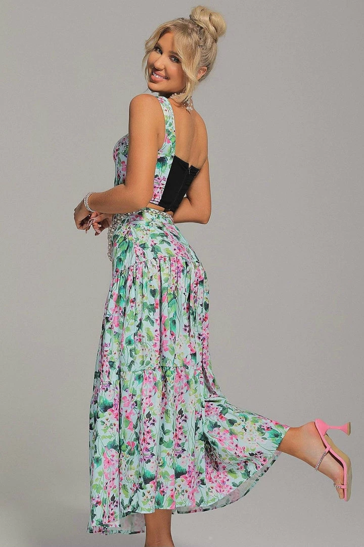 This floral pattern is everything for a summer party. Featuring a stunning floral bustier crop top. Set includes a matching high waisted maxi skirt. Pair with white strappy heels and a fun colored mini shoulder bag for a summer look we’re dreaming of!