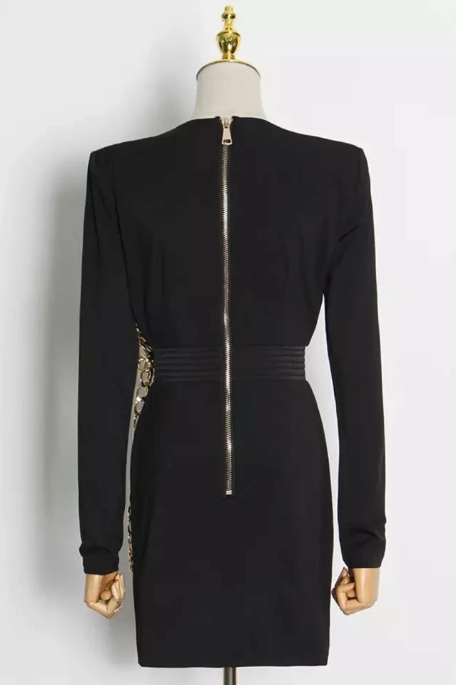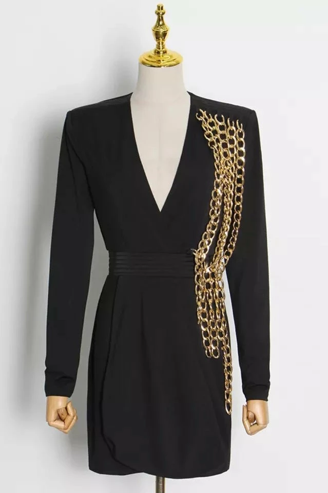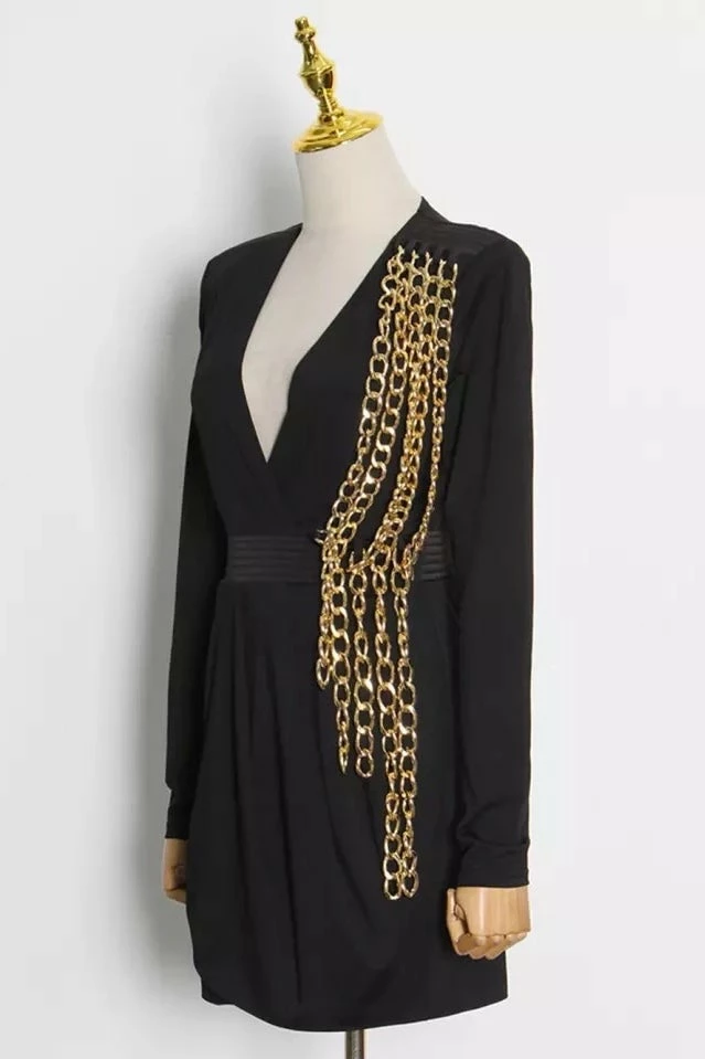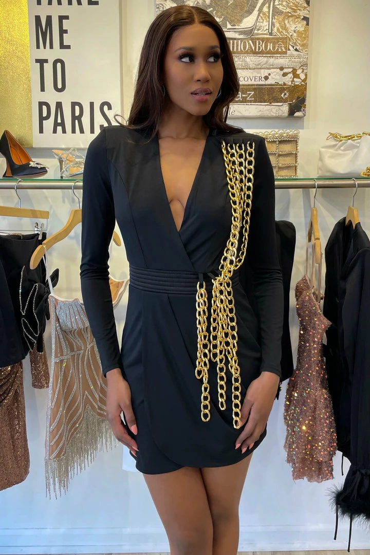 This mini dress is cocktail hour chic! Featuring a long sleeve mini dress with structured shoulders, a deep v neck, and a multi layered, draping chain detailing. Team with ankle strap heels and gold chain accessories for the perfect finish!