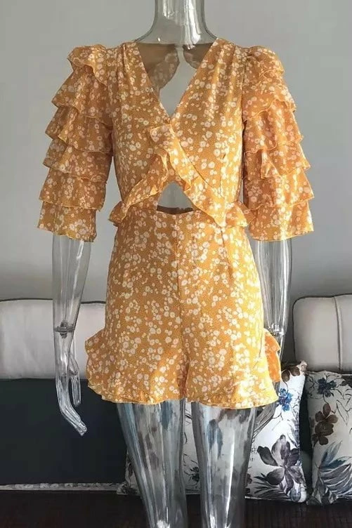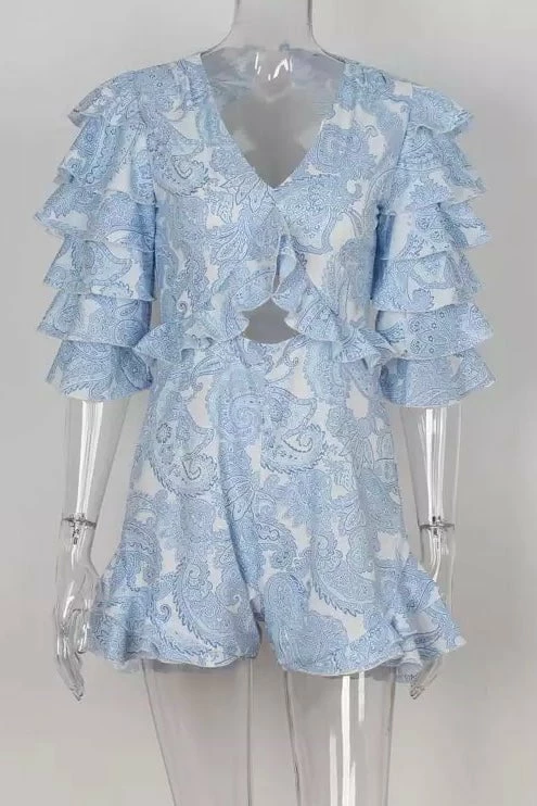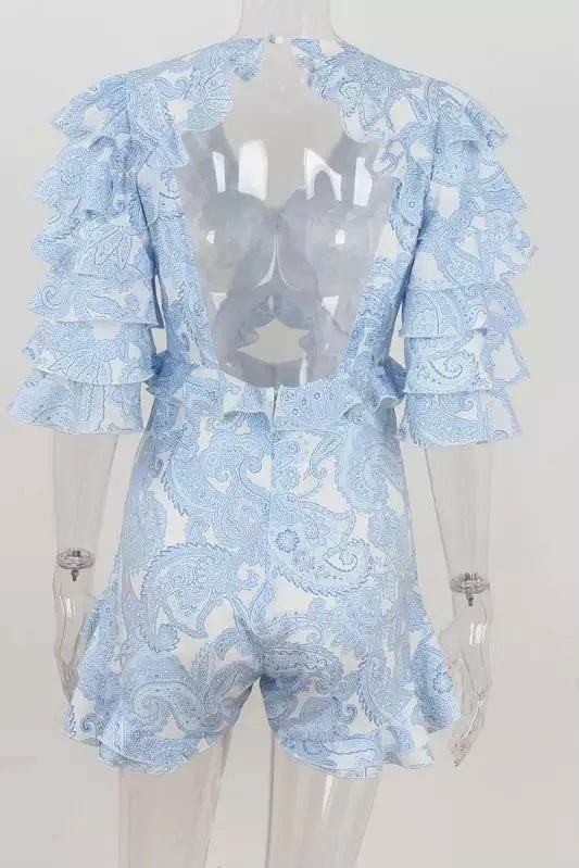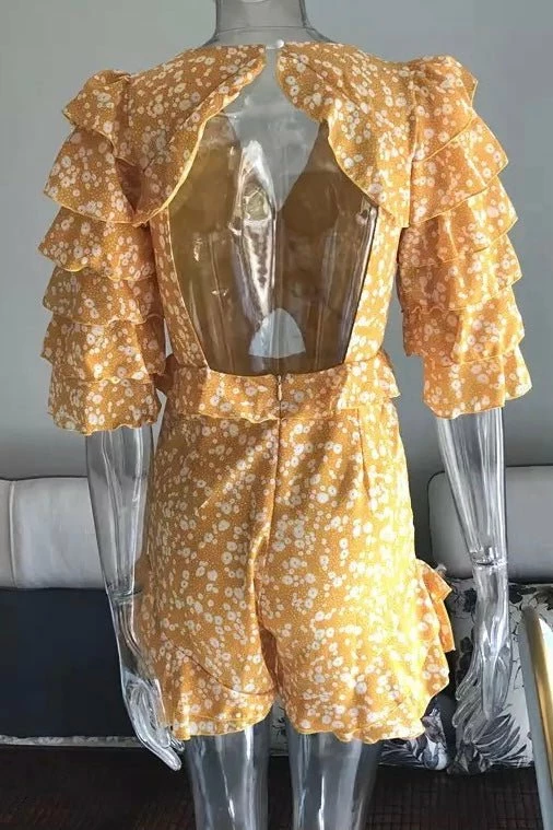 Romp right into warmer days. This adorable ruffle romper features short frilled sleeves, a floral pattern, a front cut out, and an open back design. Style around town with chunky sneakers and a crossbody or bring it out on the night with strappy heels, gold jewelry, and beachy wavy hair.