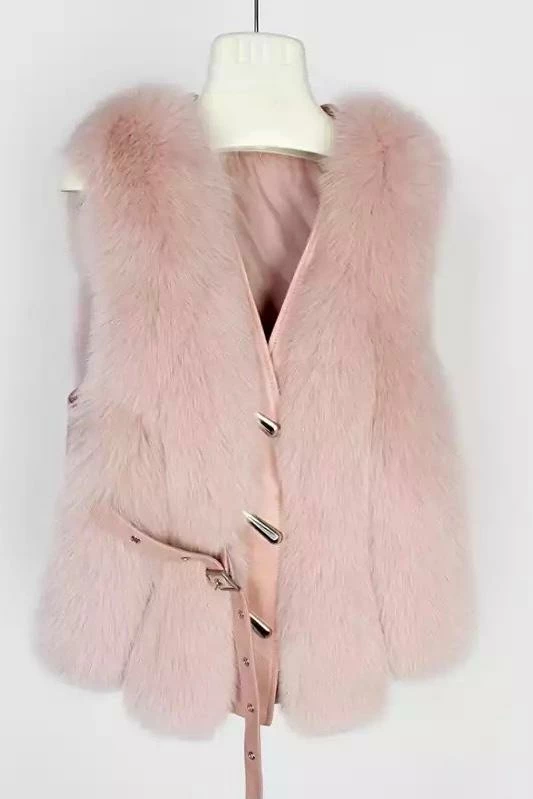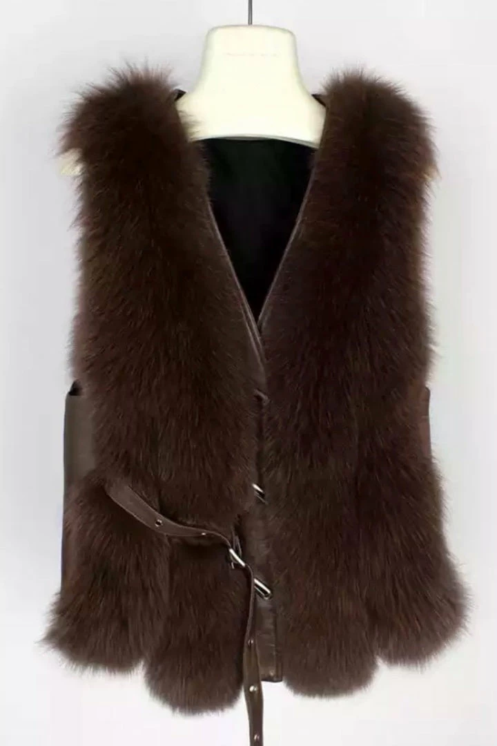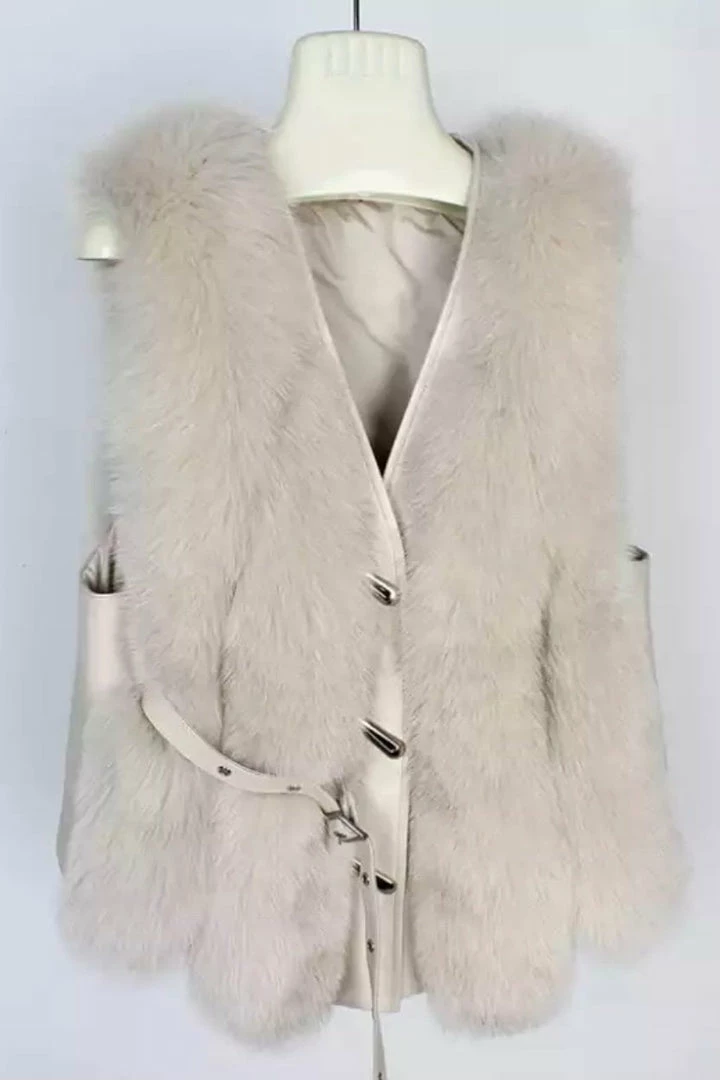 Bundle up in style this season! Featuring a sleeveless vest with three metal buttons, a fox fur and leather liner, and a belt. Pair with a long sleeve thermal and light wash jeans for a casually cute look we’re loving!
