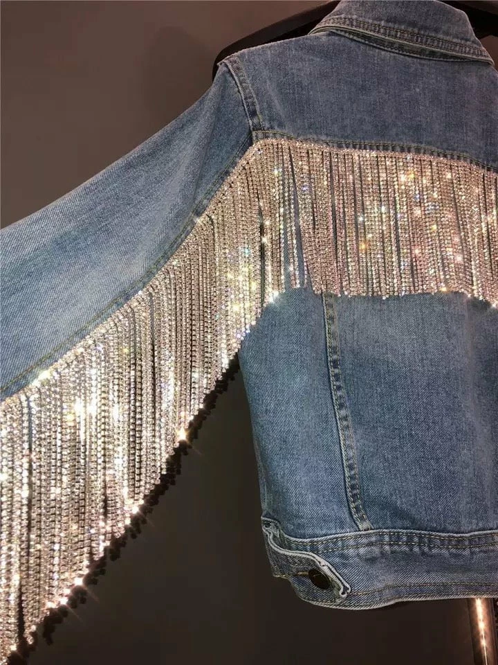 Feel yourself in this fringe number! Featuring a long sleeve denim jacket with a back and sleeve fully rhinestone tassel fringe design. Style over a rhinestone outfit and head to your next festival to stand out!