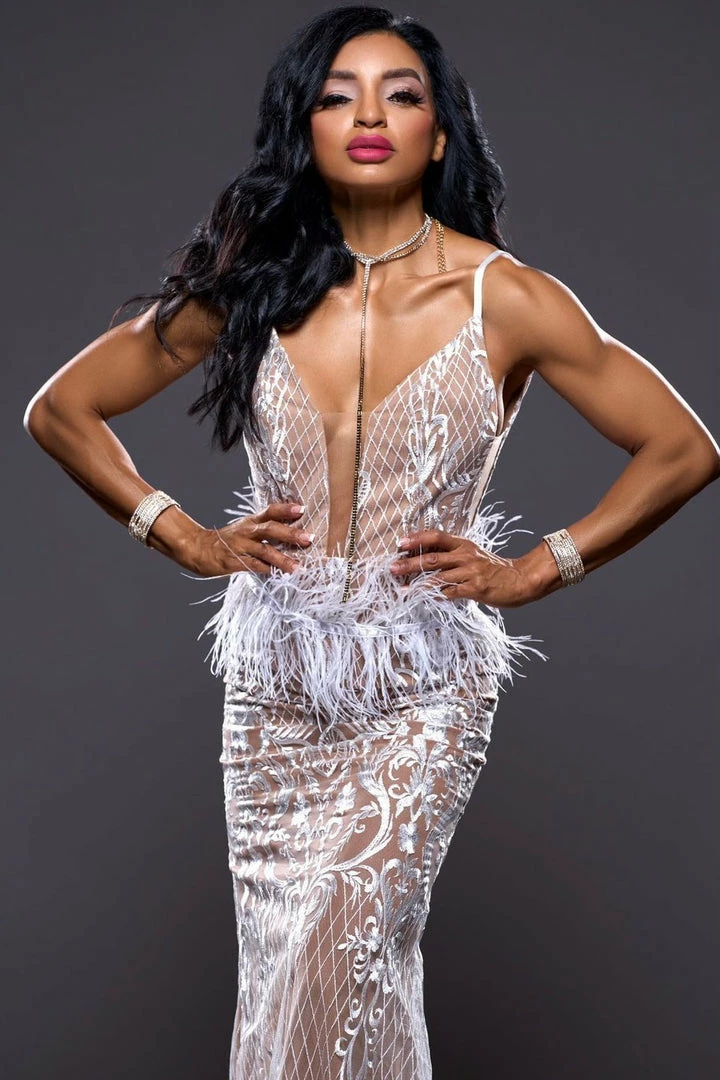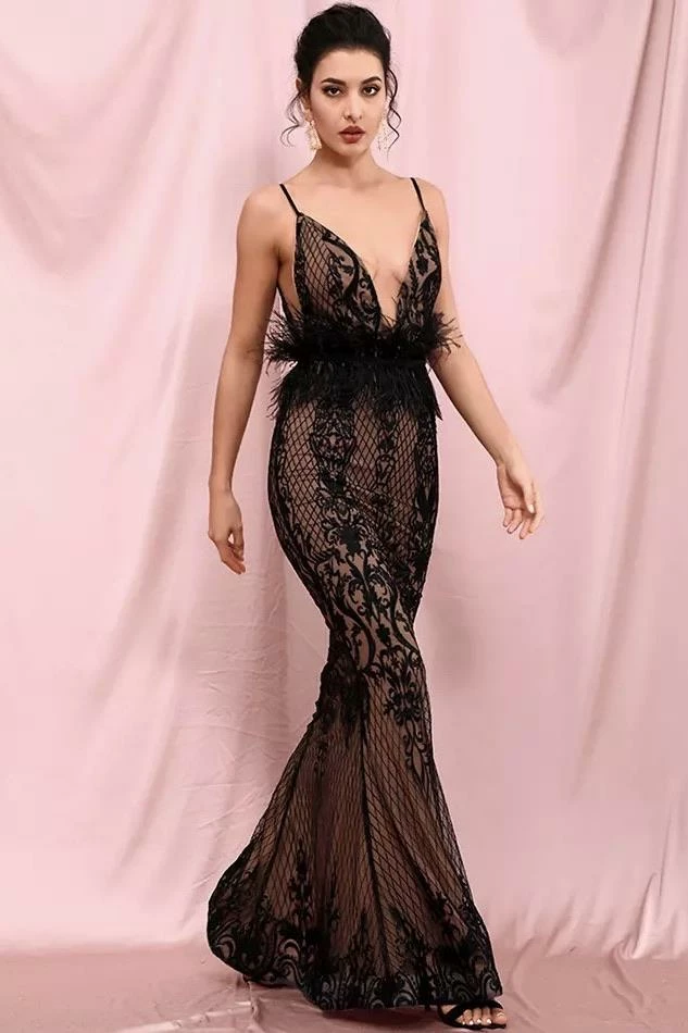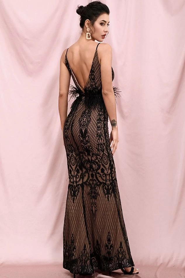 Jessica Bara Chichi V Neck Feather Belt Bodycon Gown Influencer Style