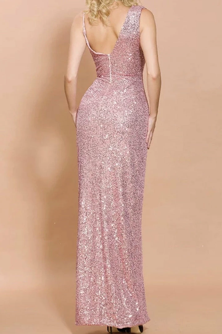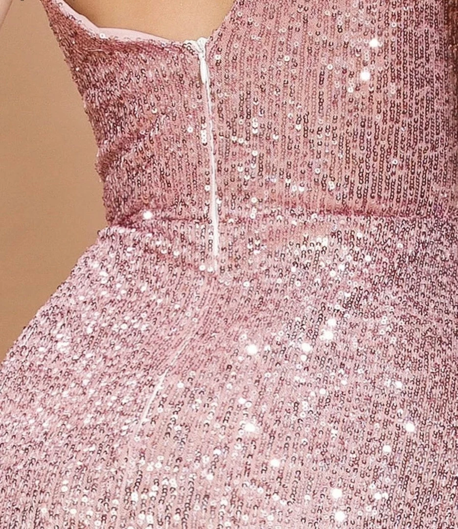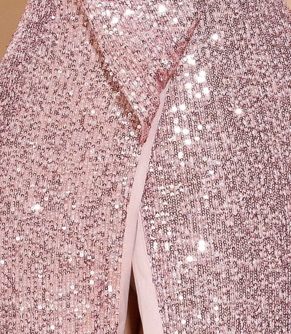 Look super elegant yet fierce in our ‘Christina’ gown. Featuring a pink sequin material, deep v-neck detail, leg slit, and floor length. Pair with nude heels and tousled waves!