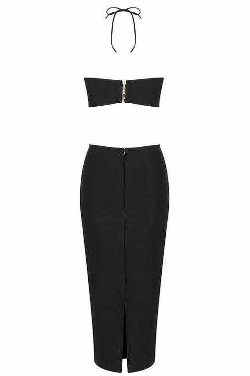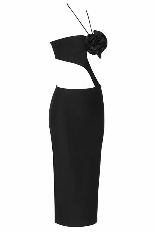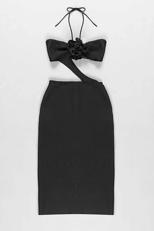 Cut out and cute! This dress features a bandage material, a halter neck strap, side cut outs, and a flower detail. Par with strappy heels and a mini bag for your next dinner date on vacation!