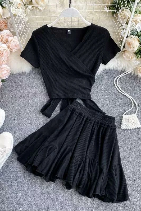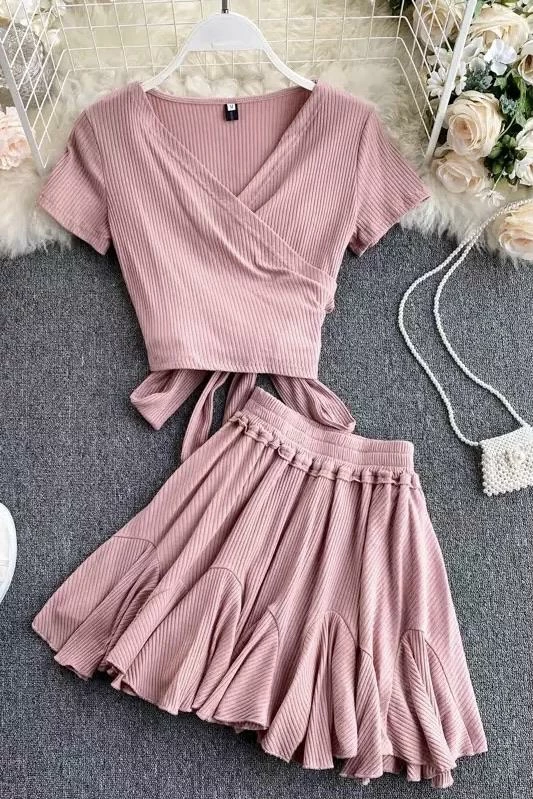 Need casual looks this season? This set is the perfect addition to your closet! Featuring a short sleeve crop top with a tie in the back and a matching high waisted, pleated mini skirt. Pair this with sneaker or sandals and a crossbody bag for a daytime look we are crushing on!