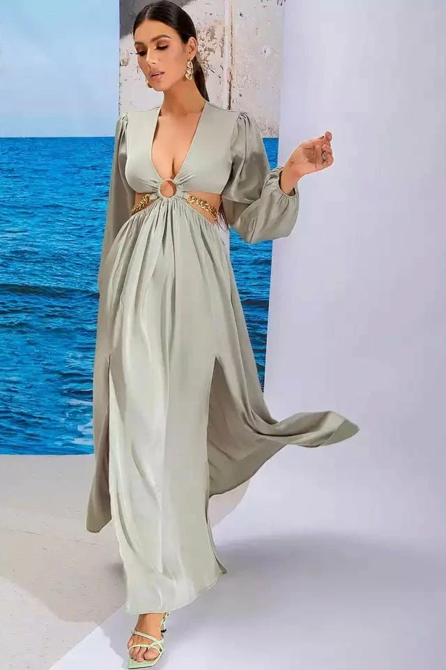 Take vacation days to new lengths in this gorgeous maxi. The Clarke maxi features stunning cut outs with chain details an open back with an adjustable tie and long puffy sleeves.