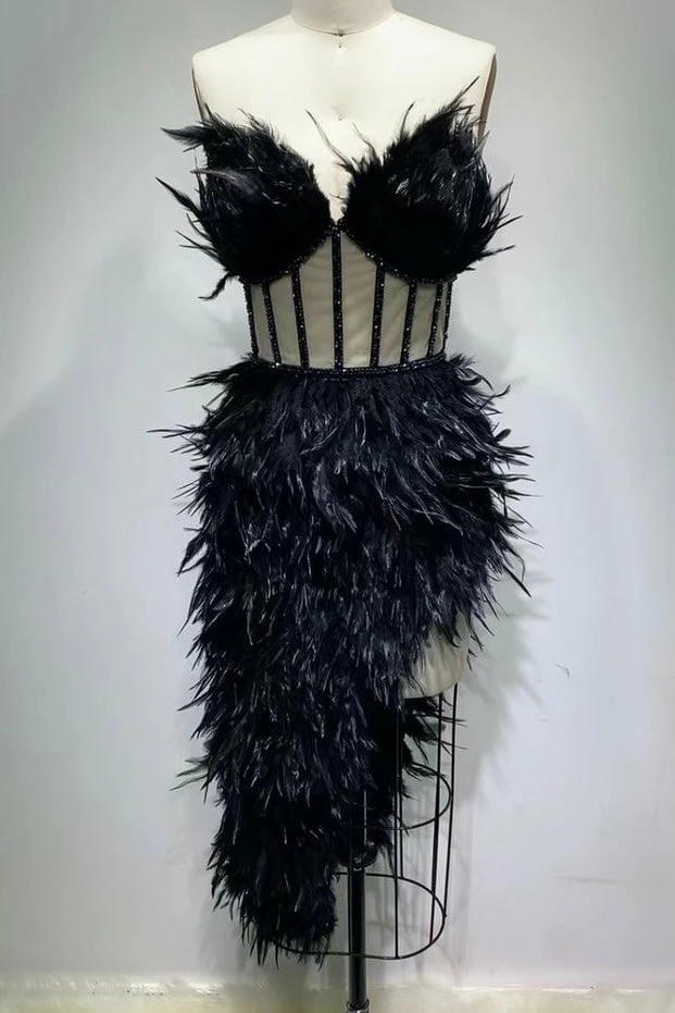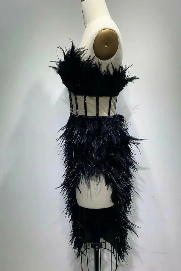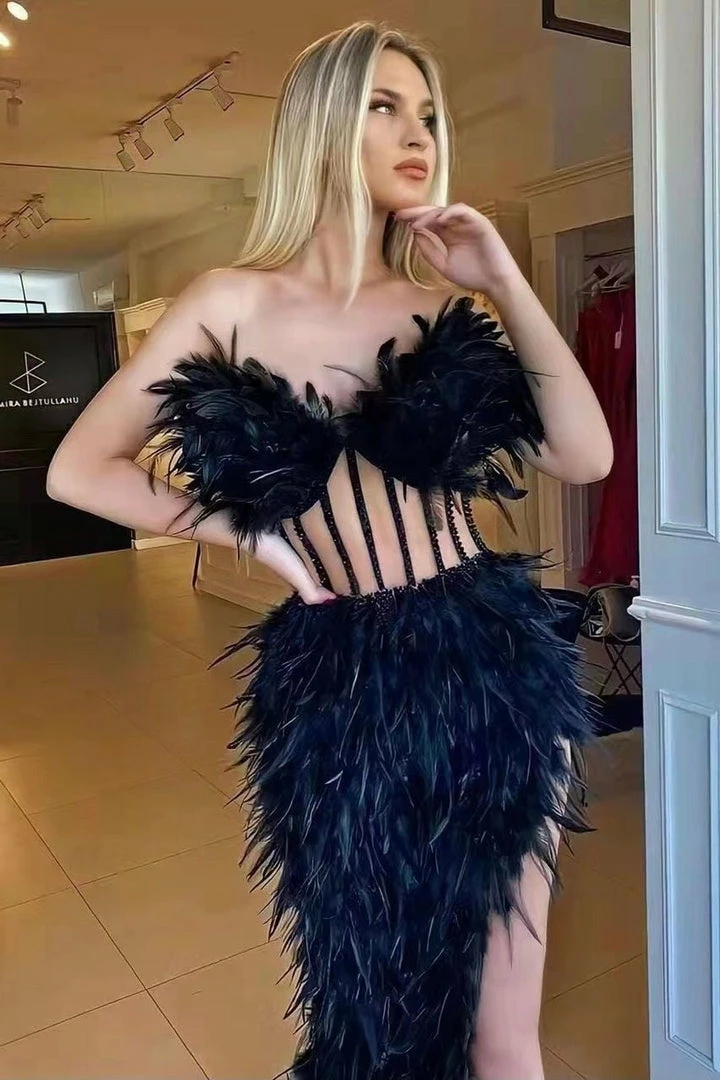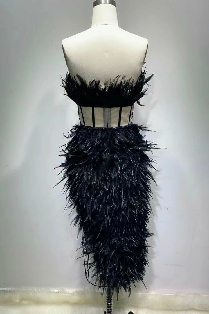 Look like the life of the party with this glamorous gown! Featuring a midi length dress decorated in gorgeous ostrich feathers, a thigh high leg slit, and a strapless neckline. Add a simple clutch, pumps and steal the night at your next event!