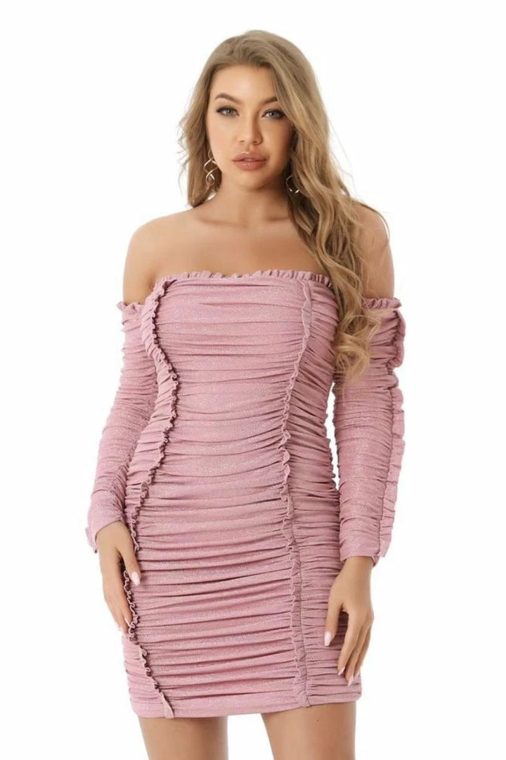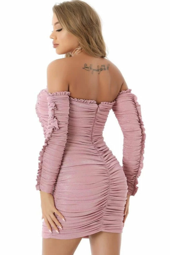 This off-the-shoulder mini dress features light ruching throughout and long sleeves, a piece every Reve Doll can feel confident in! Pair with your favorite light pink accessories and loose waves for a timeless going out look.