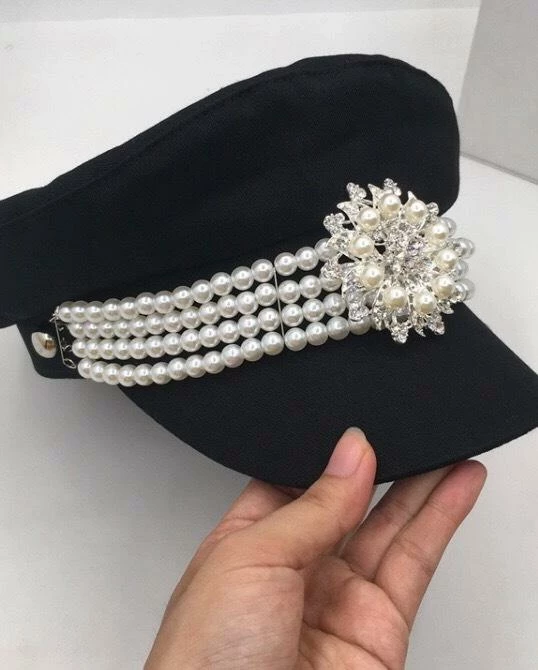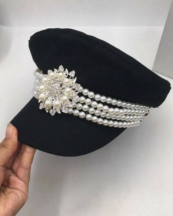 This chic conductor hat includes four rows of pearl embellishments and large flower in the center.