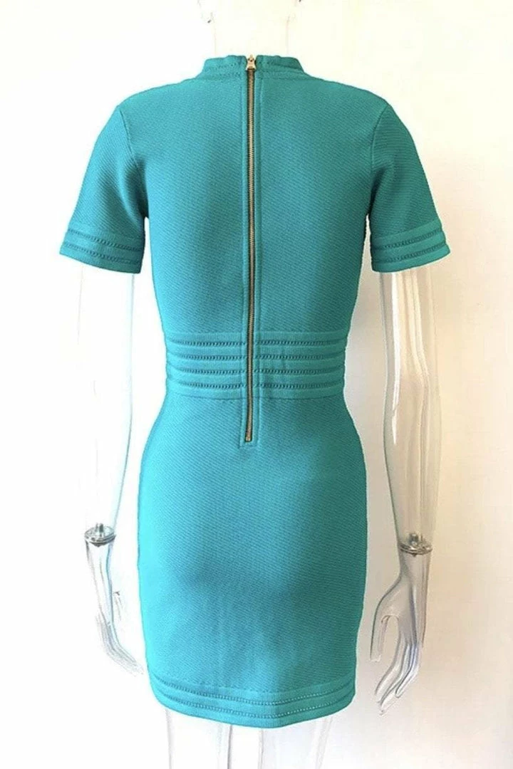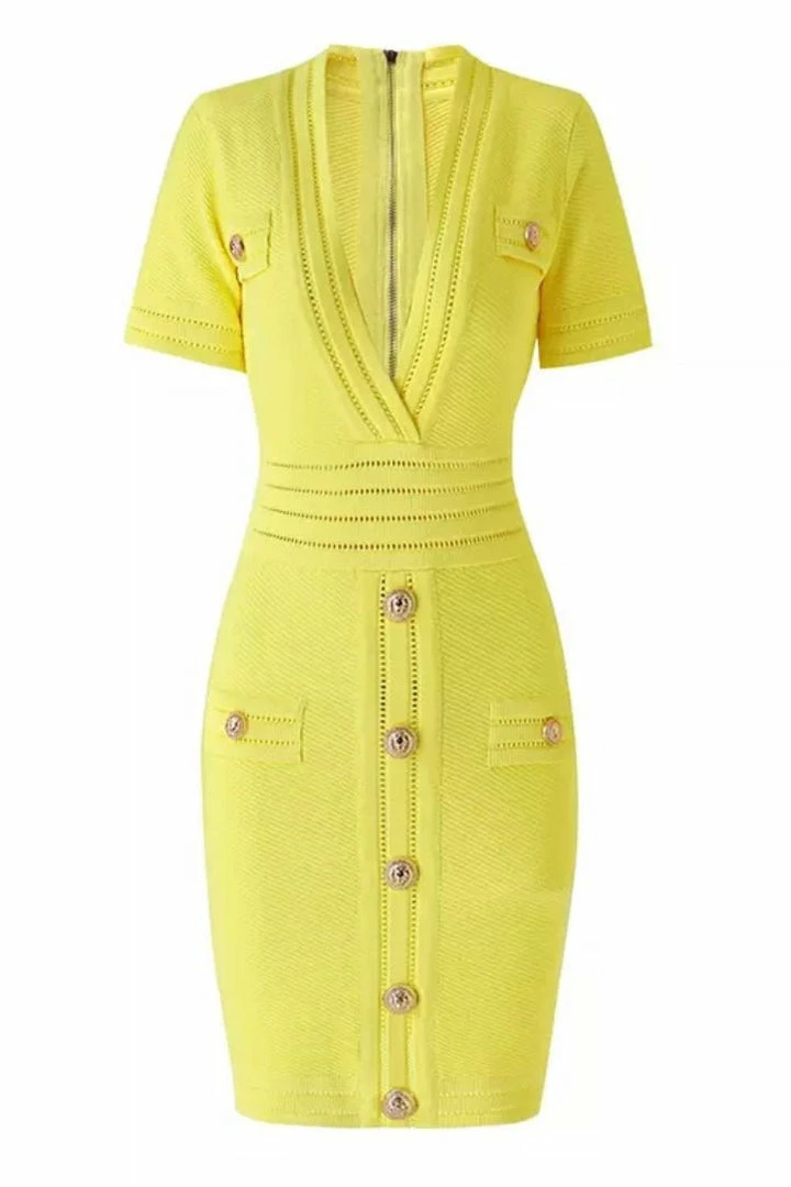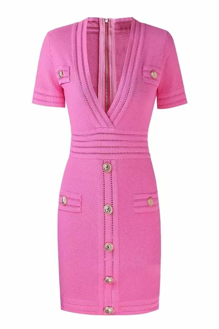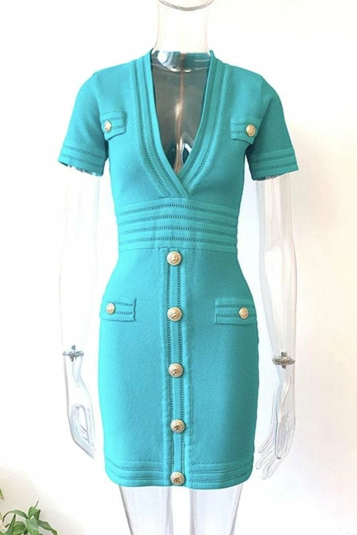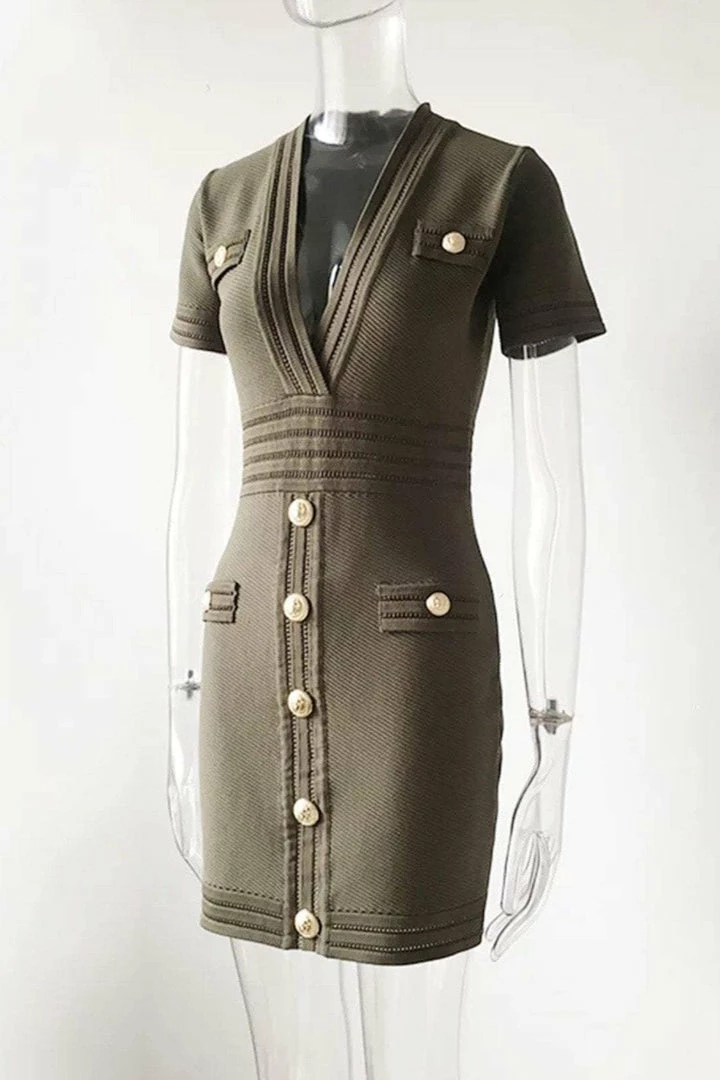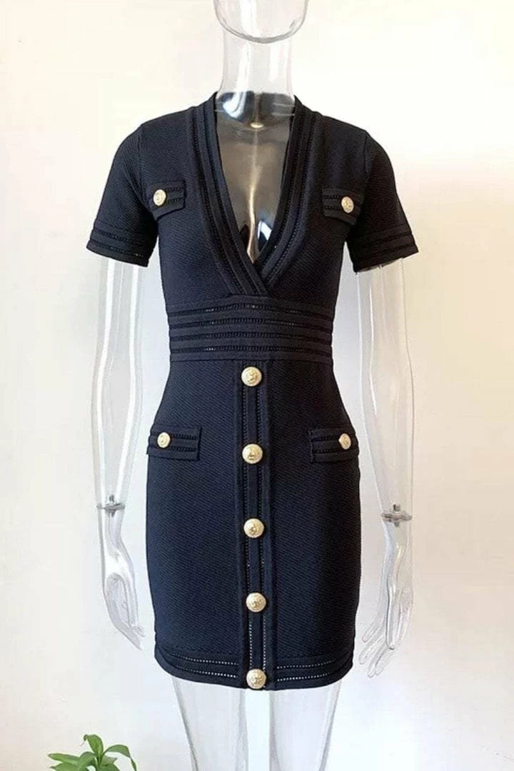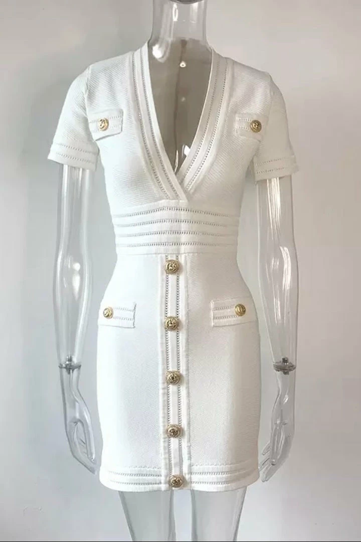 Look like a true boss babe in our ‘Coco’ dress! Featuring a bandage material, short sleeves, v-neck style, button details, bodycon fit, mini length, and zipper closure. Pair with black pumps and a killer clutch!
