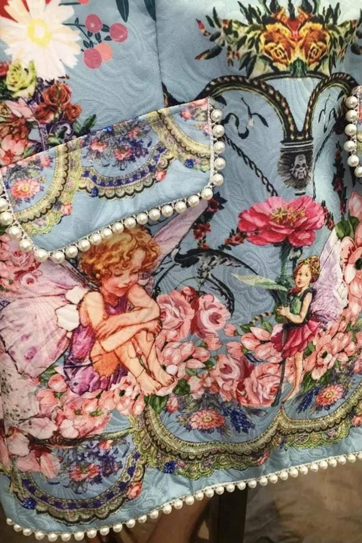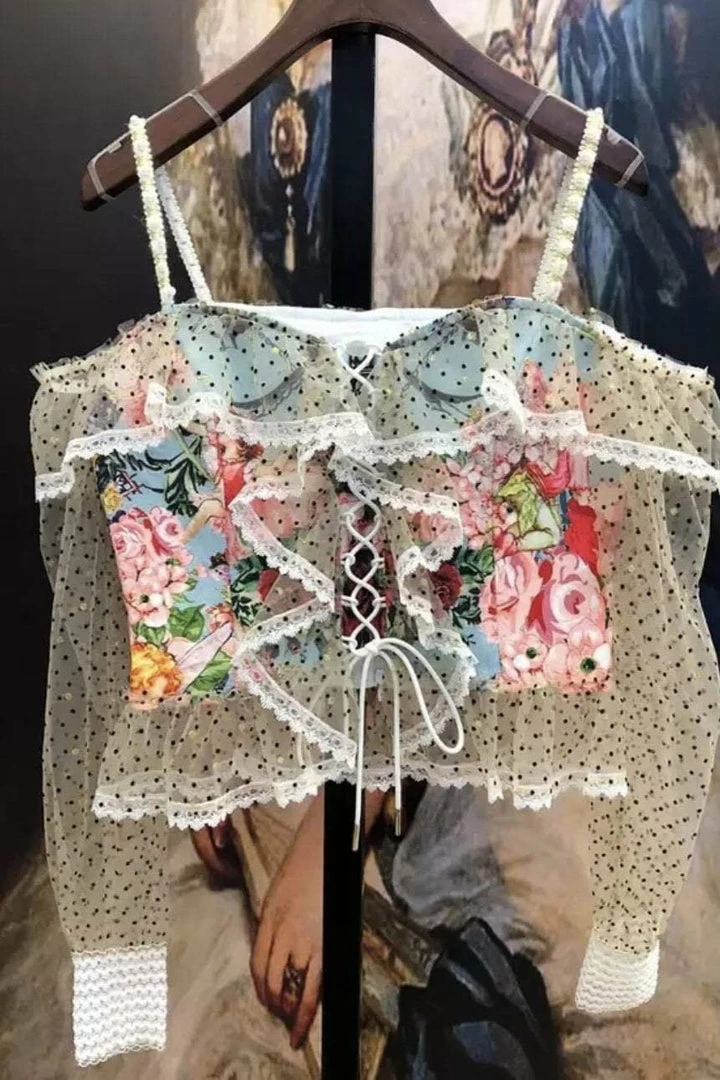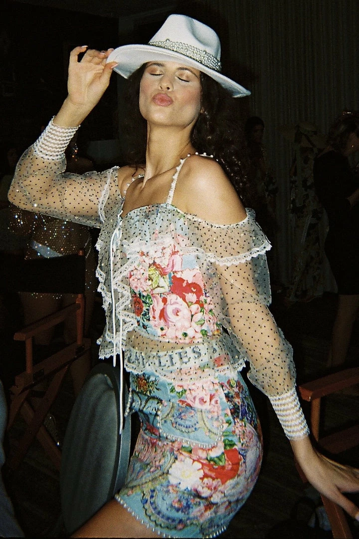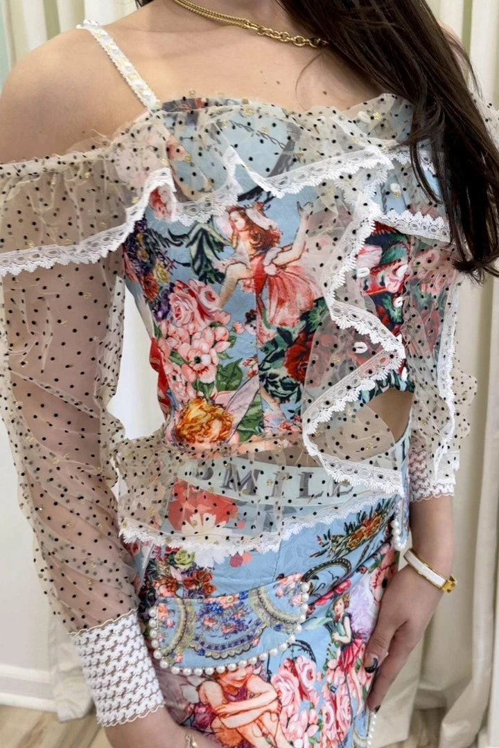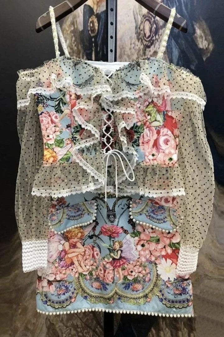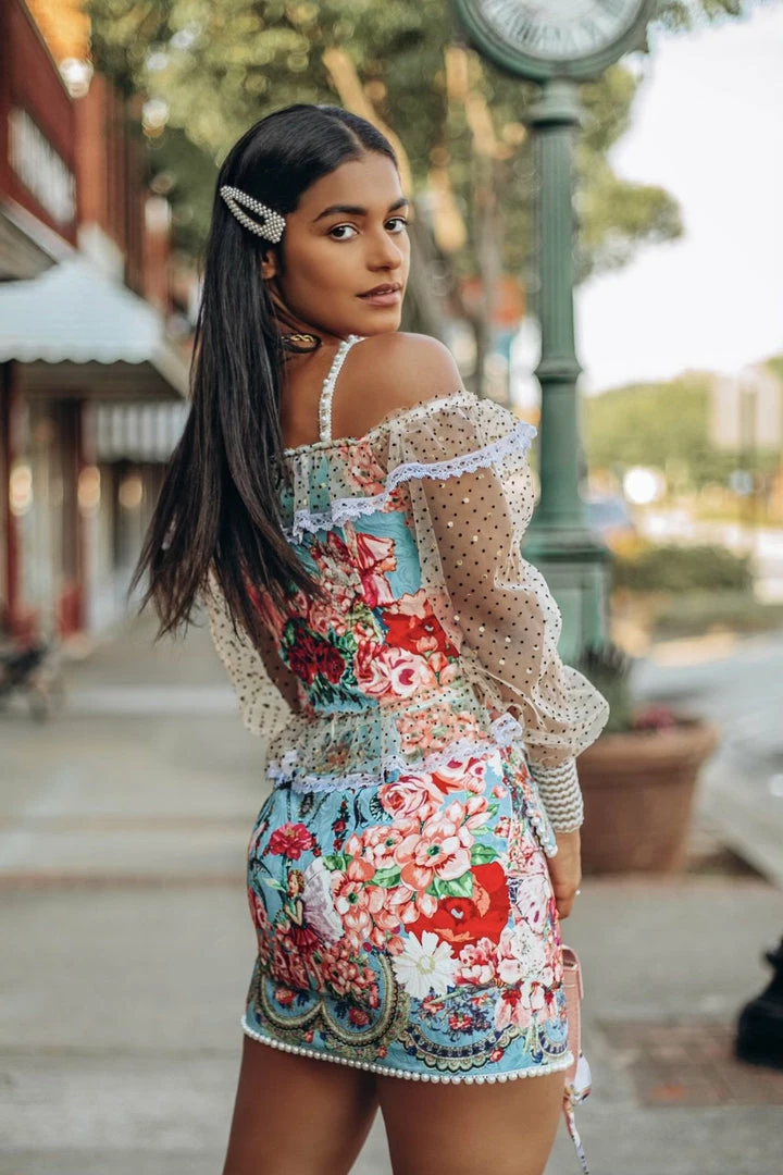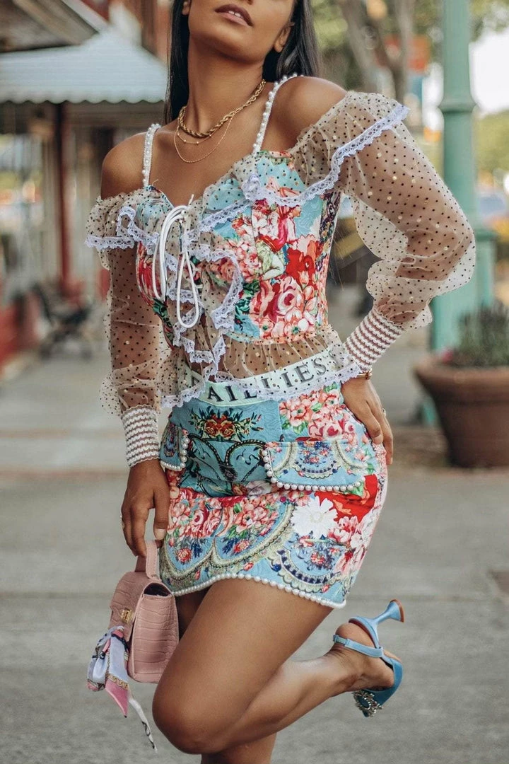 This two piece set features a top with a lace up center, off the shoulder long sleeves, and a skirt with pearl embellishments and in intricate pattern. Be a walking work of art in this unique set!