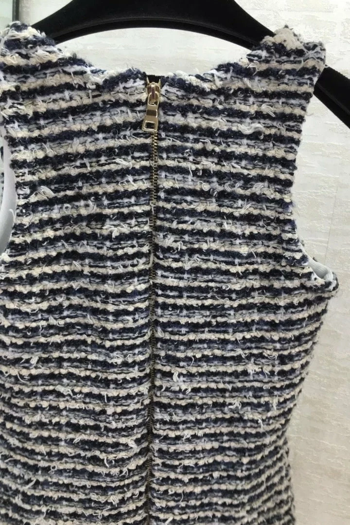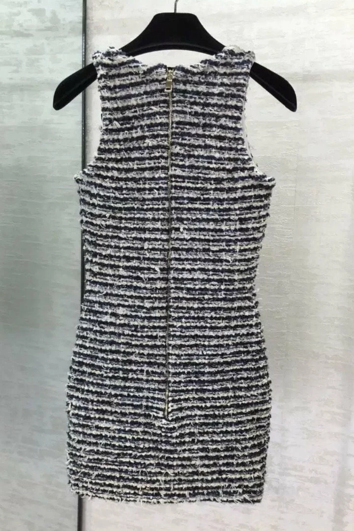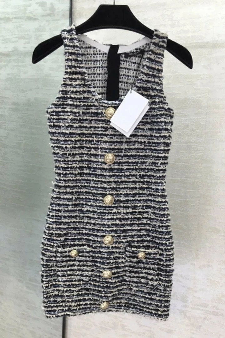 This mini is perfect for your next fall event! Featuring a tweed material, tank style, gold button embellishments, bodycon fit, and a mini length. Pair with a long sleeve top underneath and boots to complete the look!