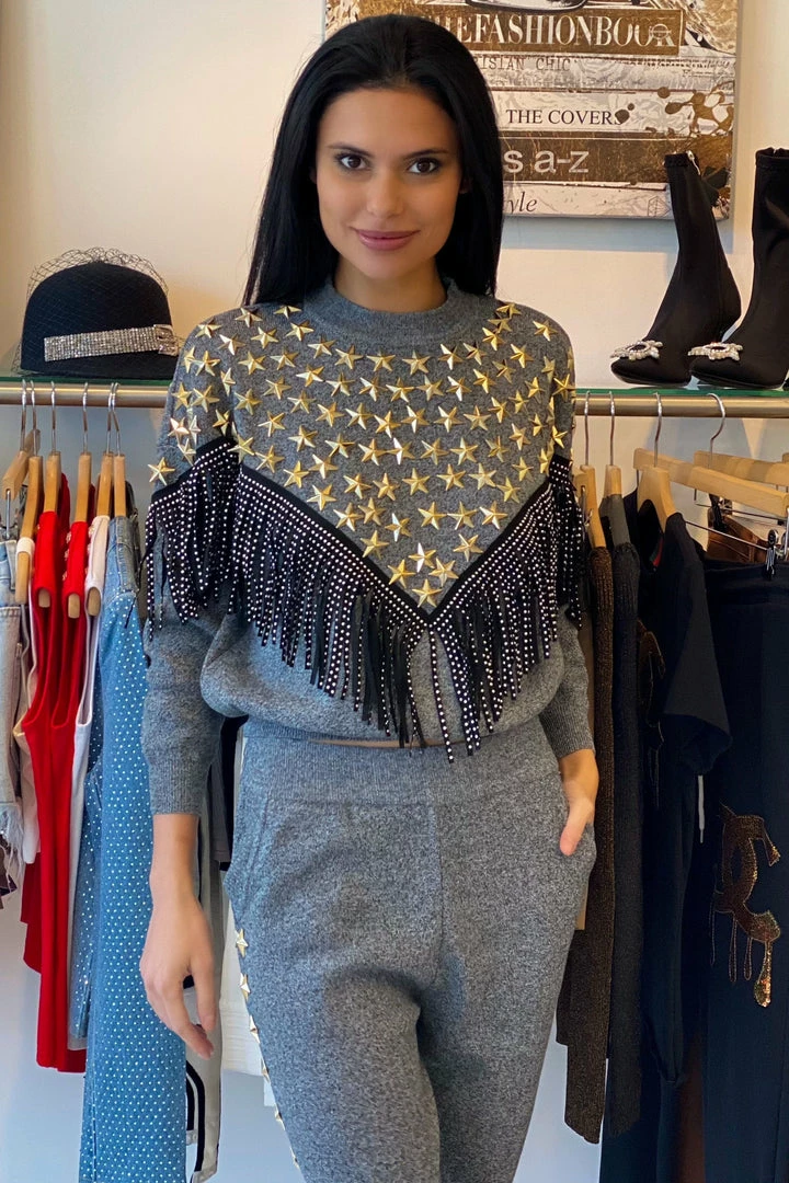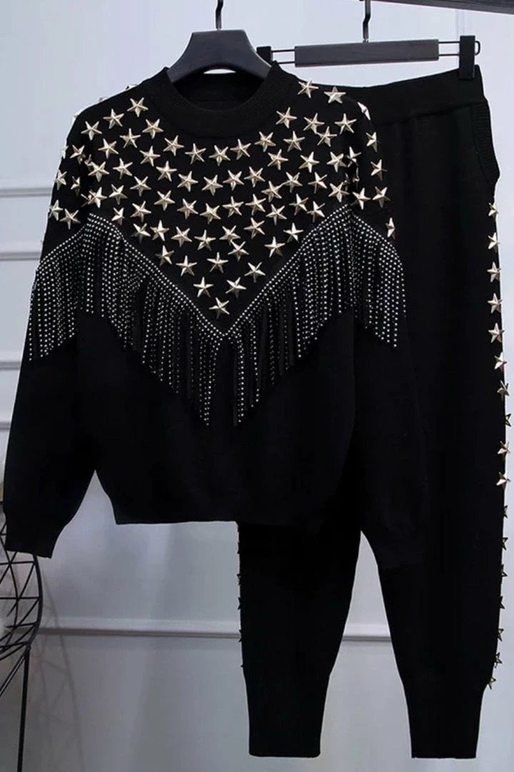 This comfy, yet stylish set includes a long sleeved pullover with star and fringe embellished details, with matching high waisted joggers. Pair with white sneakers and a high ponytail for a cute & chill everyday look.
