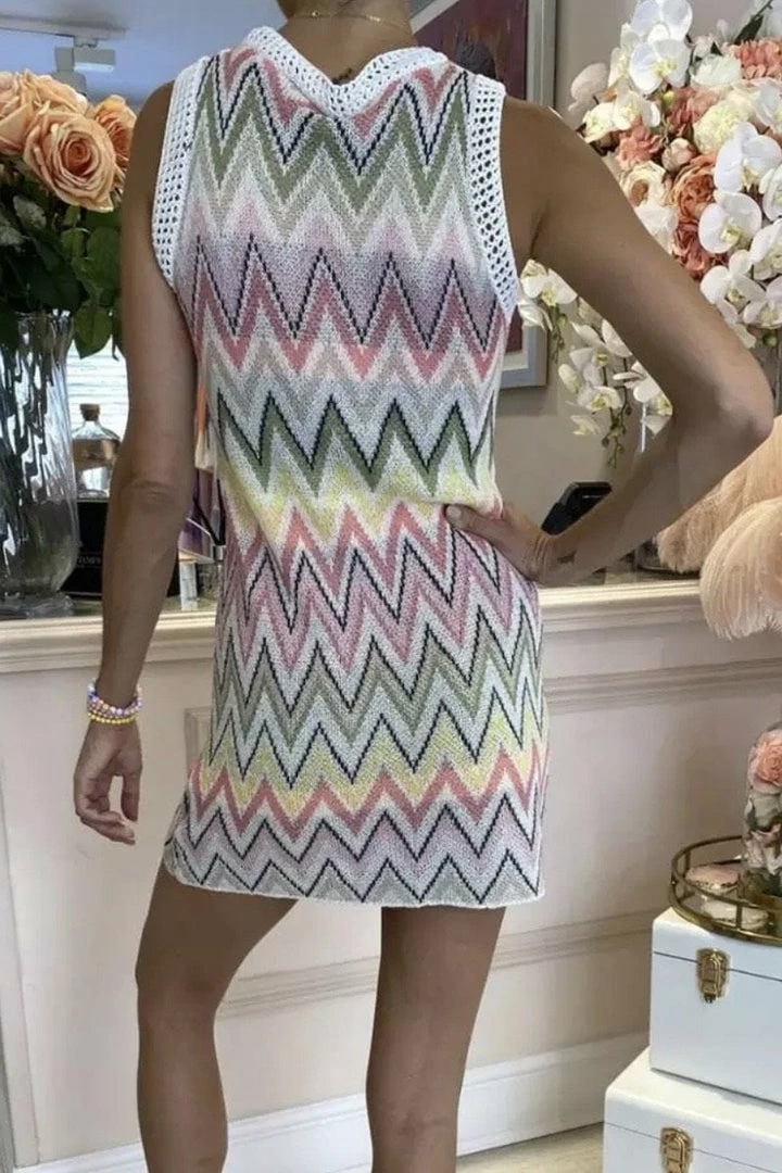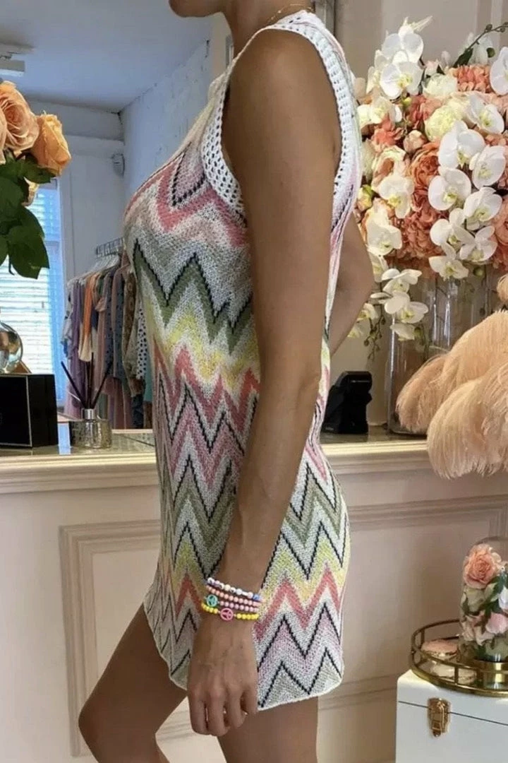 This style features a sleeveless detail, patchwork knit material, and a mini length. Pair with oversized sunglasses and a straw tote for a summer look!