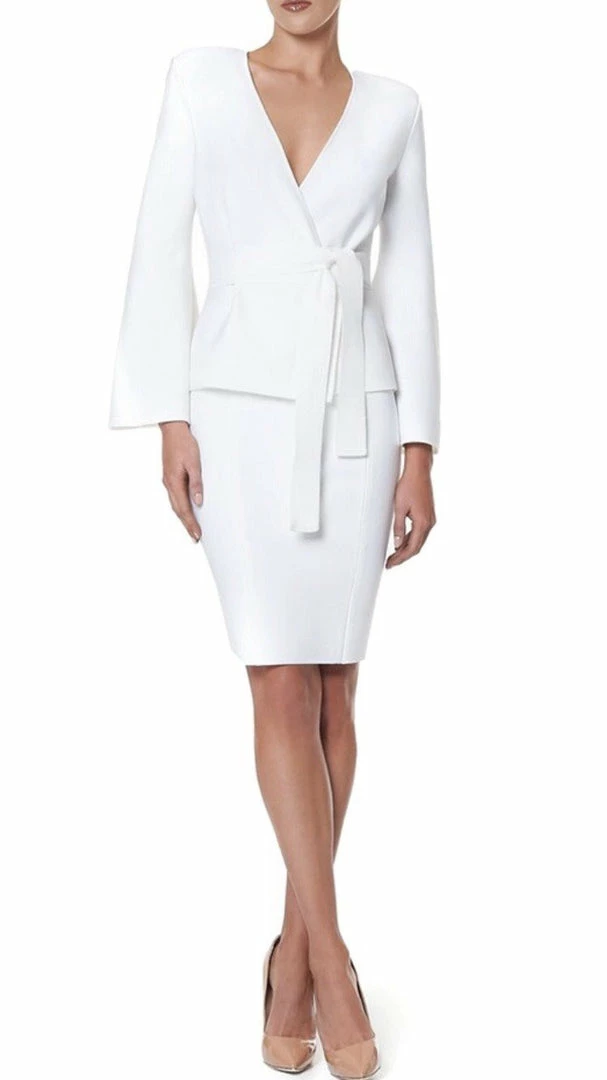 The ideal level of sophisticated and feminine, our ‘Dakota’ two piece set includes a bandage material, long sleeves, belted detail, and form-fitting skirt.