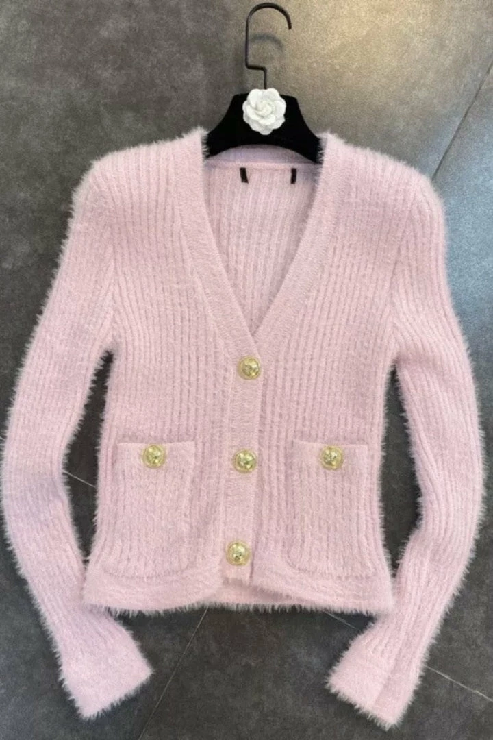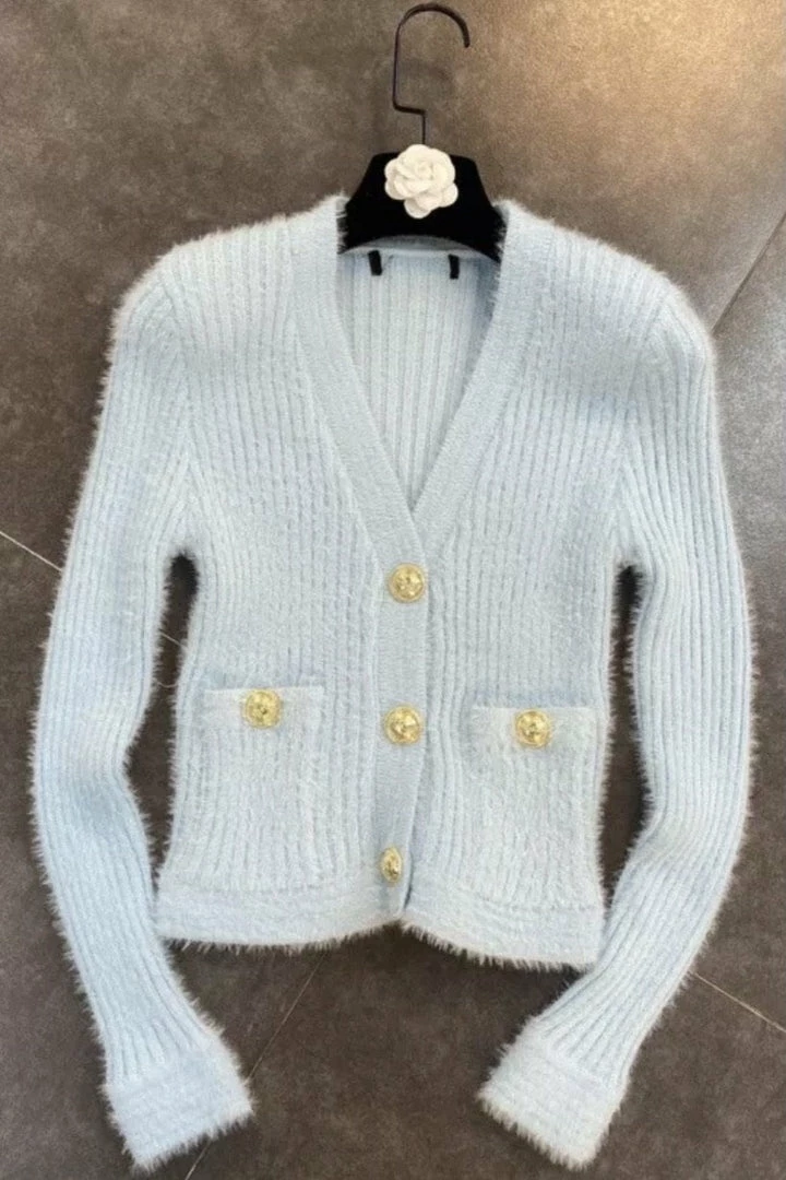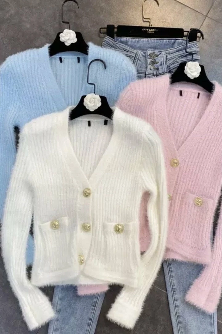 Knitwear paired with your favorite denim is a must for a day look. Featuring a fuzzy knit fabric with a long sleeve design and gold button embellishments. Team this with denim and fresh kicks for the perfect stay home combo.