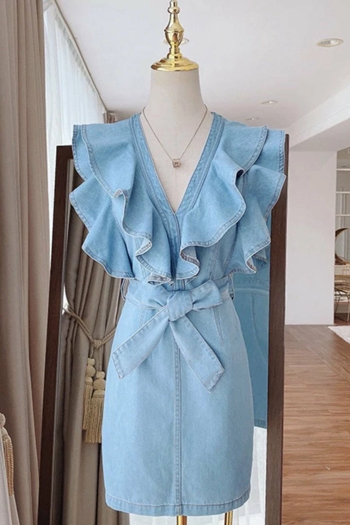 Slip into something so easy yet cute this season with the ‘Dallan’ mini! Featuring a denim material, ruffle details, belted waist, and a mini length. Pair with sneakers for the daytime or dress it up with nude heels!
