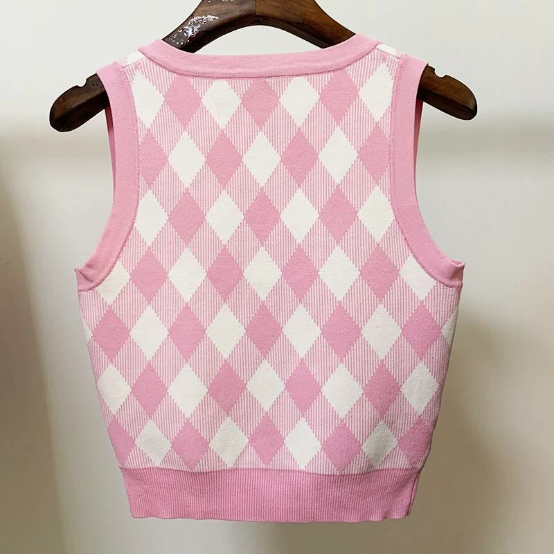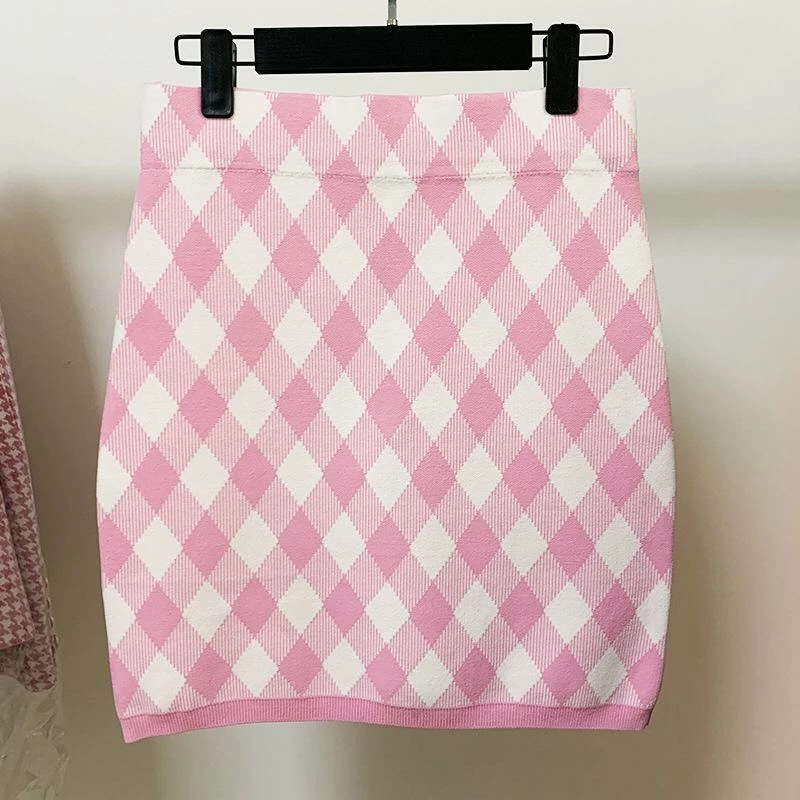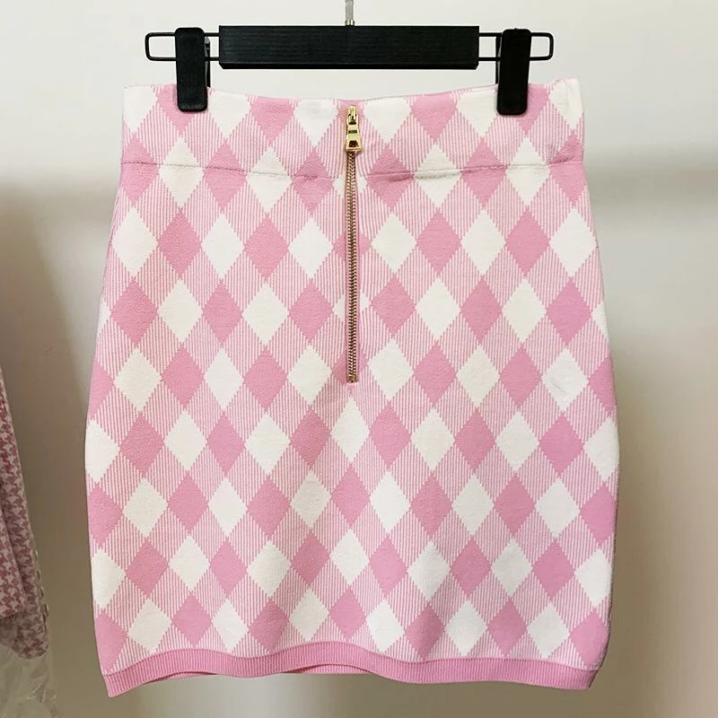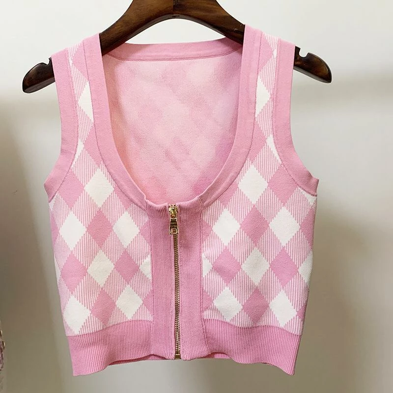 This one’s for the girly girls. This two piece set features a cropped tank top with a square collar and a zip fastening on the front paired with a high wasted bodycon mini skirt. Team this pink plaid set with barley there heels and a white cropped cardigan to step up your daytime look.