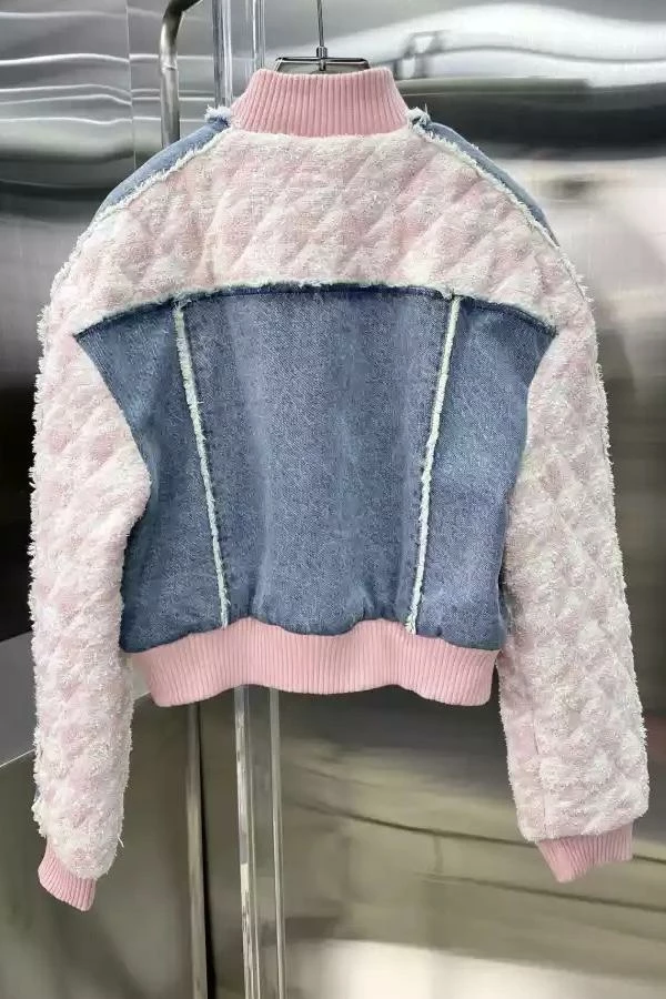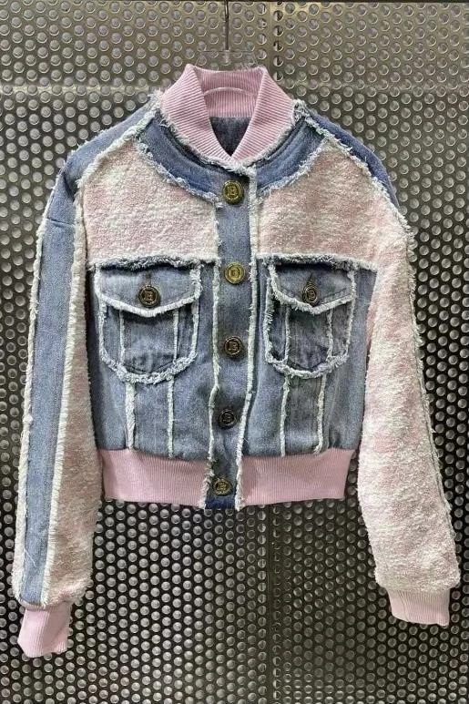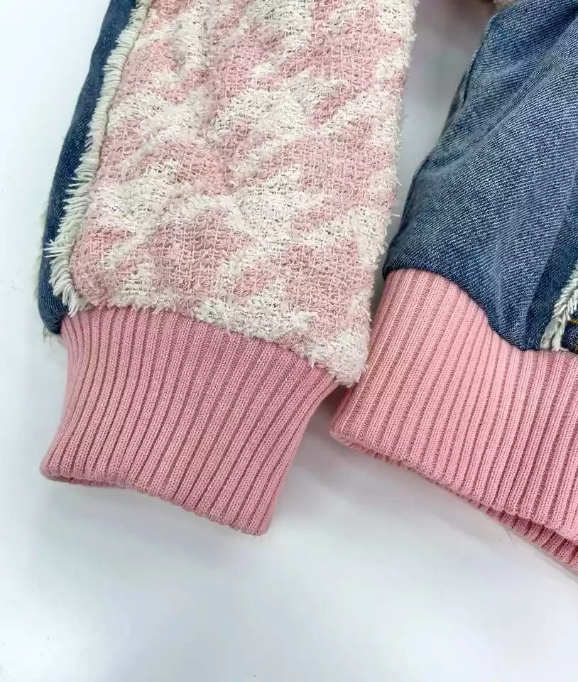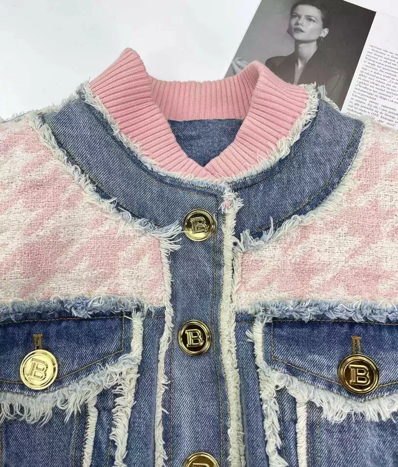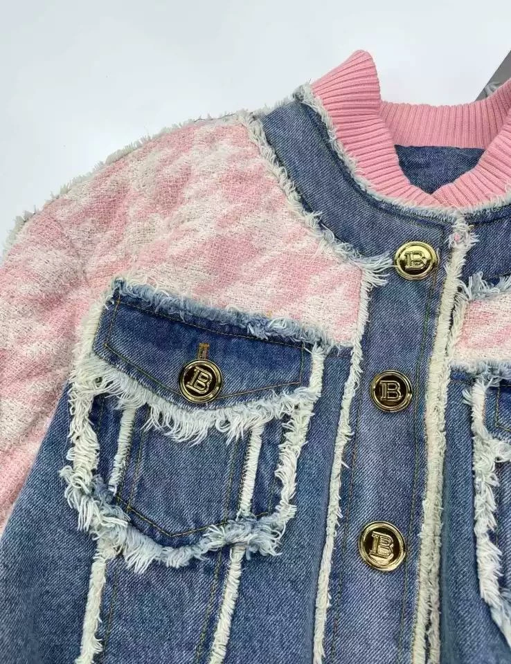 This jacket was made for you dolls! Featuring a denim jacket with gold button details, a pink houndstooth patchwork design, and white distressed seam stitching. Pair with the matching “Alice denim skirt” and high knee boots to stay warm in style this season.