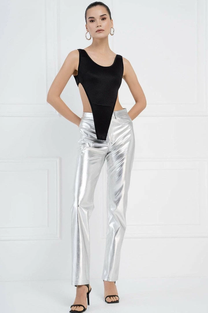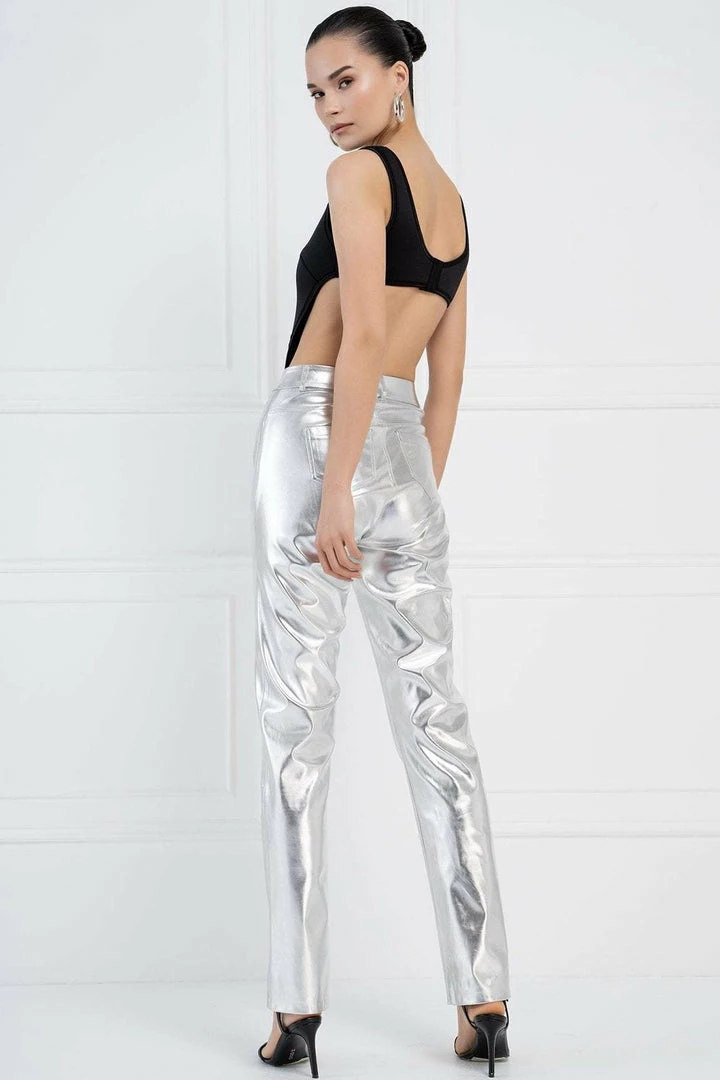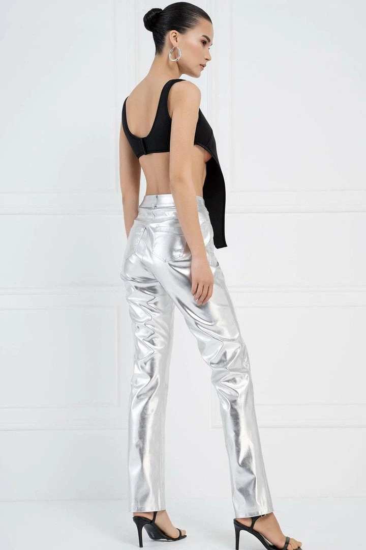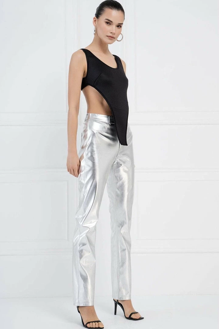 Catch everyone’s eye in the club this season. Featuring a shiny leather pant with pockets, front zip fastening, and baggy fit. Pair with a tight ribbed tank top and open toe shoes for a casually cool night out!