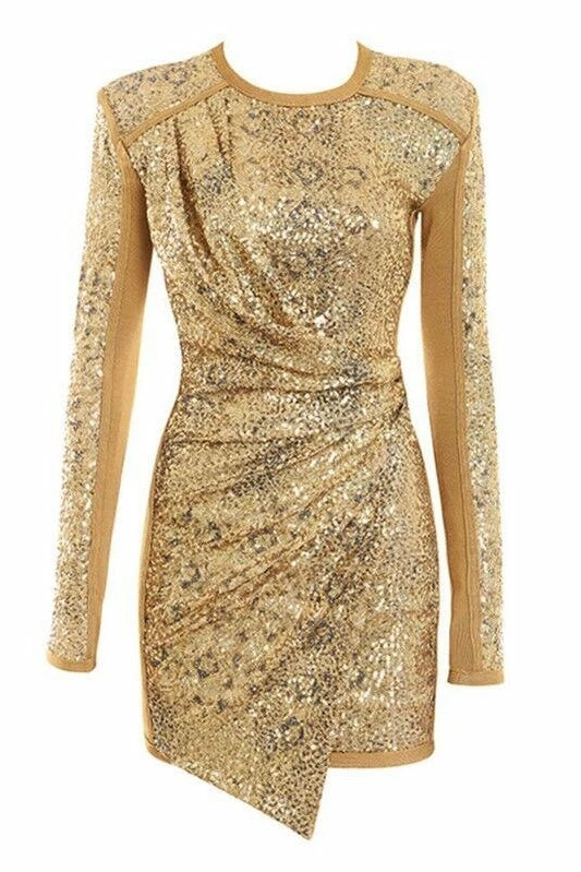 Upgrade your cocktail closet with this dazzling mini! Featuring long sleeves, a fully sequined style over a bandage material, colorblock accents to highlight the sparkle, and a twisted ruched midcenter with an irregular hem. Pair with a gold chain purse and long glitzy earrings to complete the outfit!