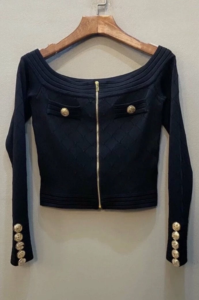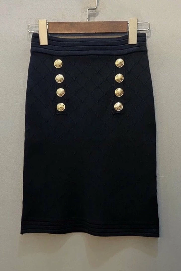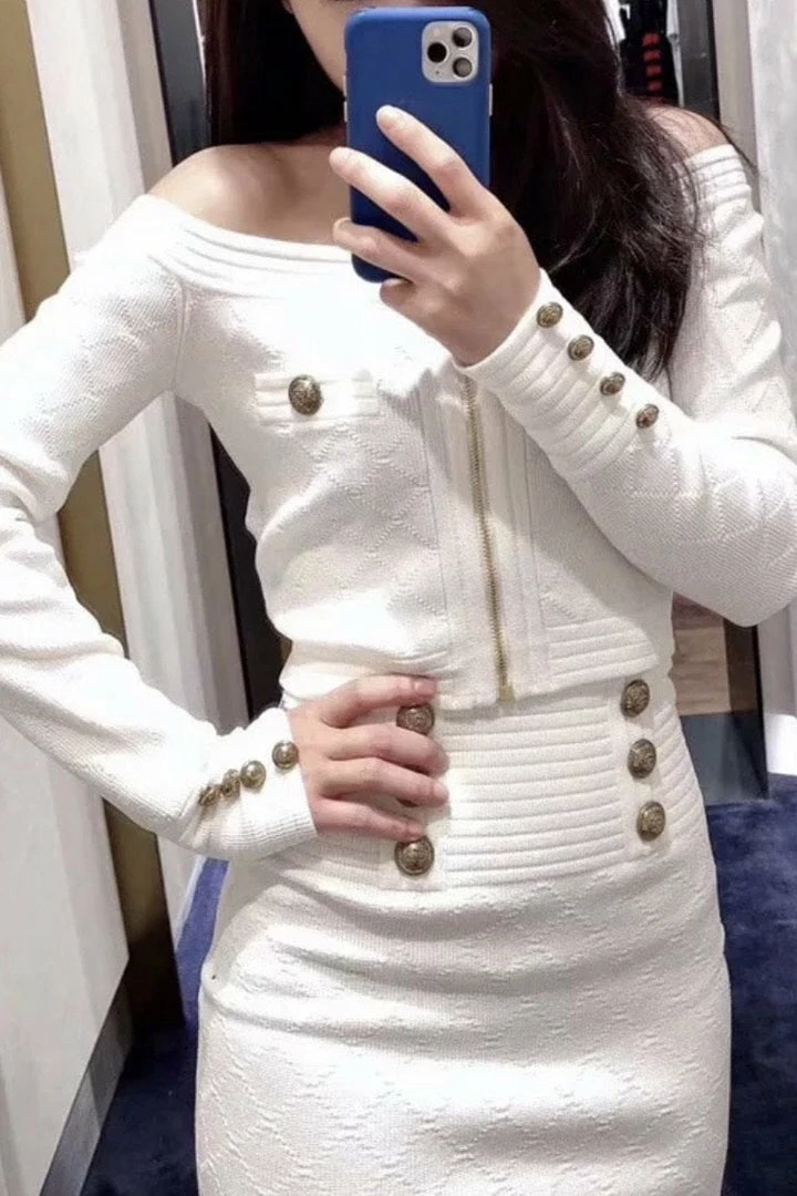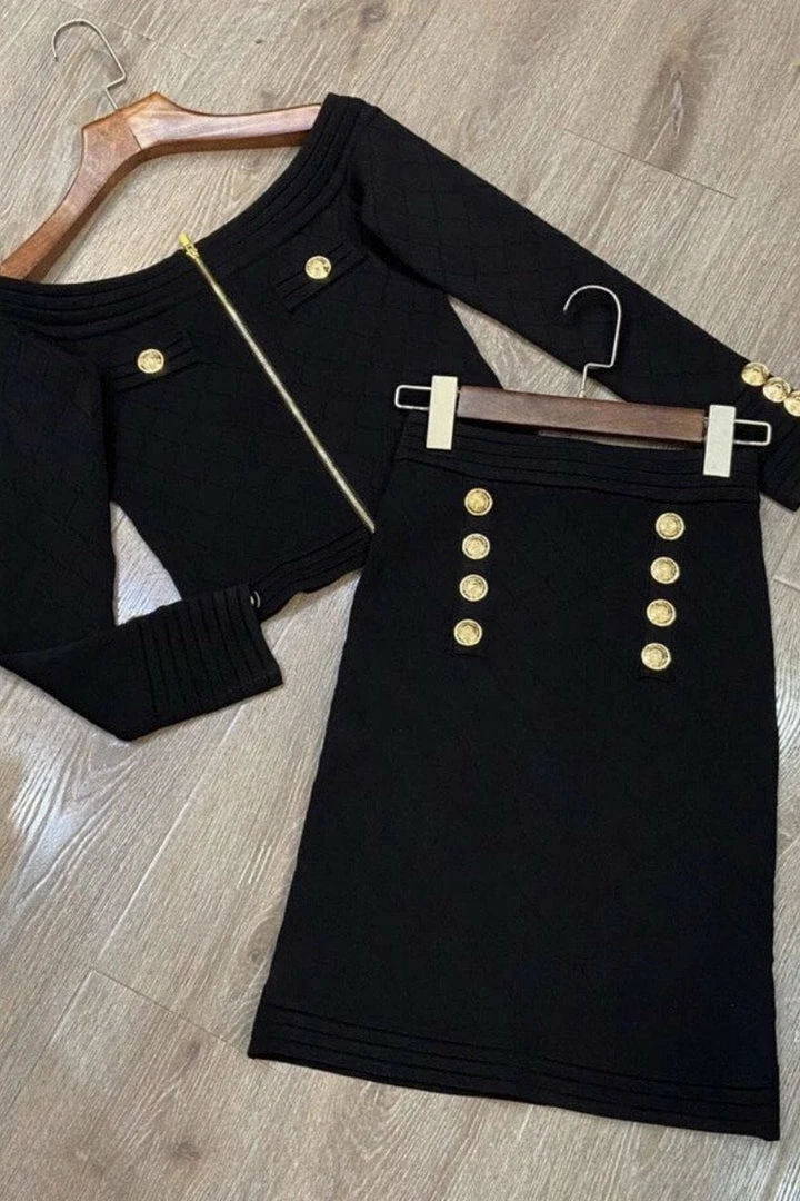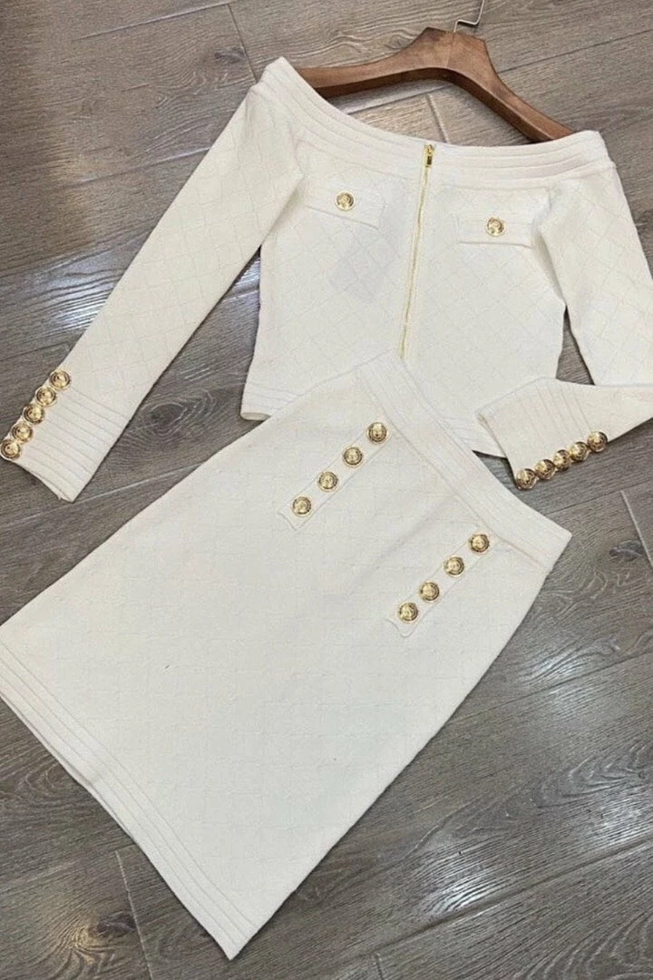 This two piece features a knitted material, off the shoulder quilted top with gold embellishments, and a matching high waisted mini skirt.
