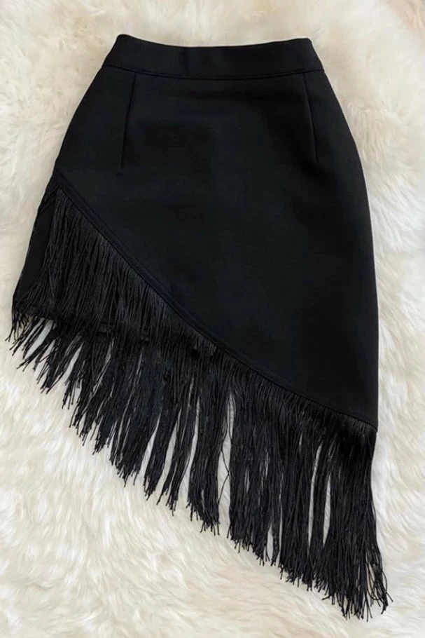 This mini skirt is a vacation essential. Featuring a high waisted mini skirt with an asymmetrical hem and fringe tassel detailing. Style with platform sandals and a colored crop top for your next trip to Tulum!