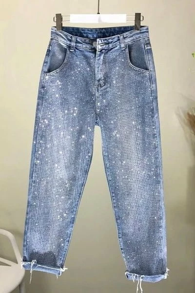Dazzle up your daily wardrobe! These high rise jeans feature a baggy fit and fully rhinestone design. Pair it during the day with a tank and flip flops or style for the night with a crop top and heels!