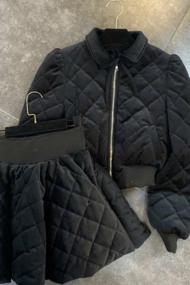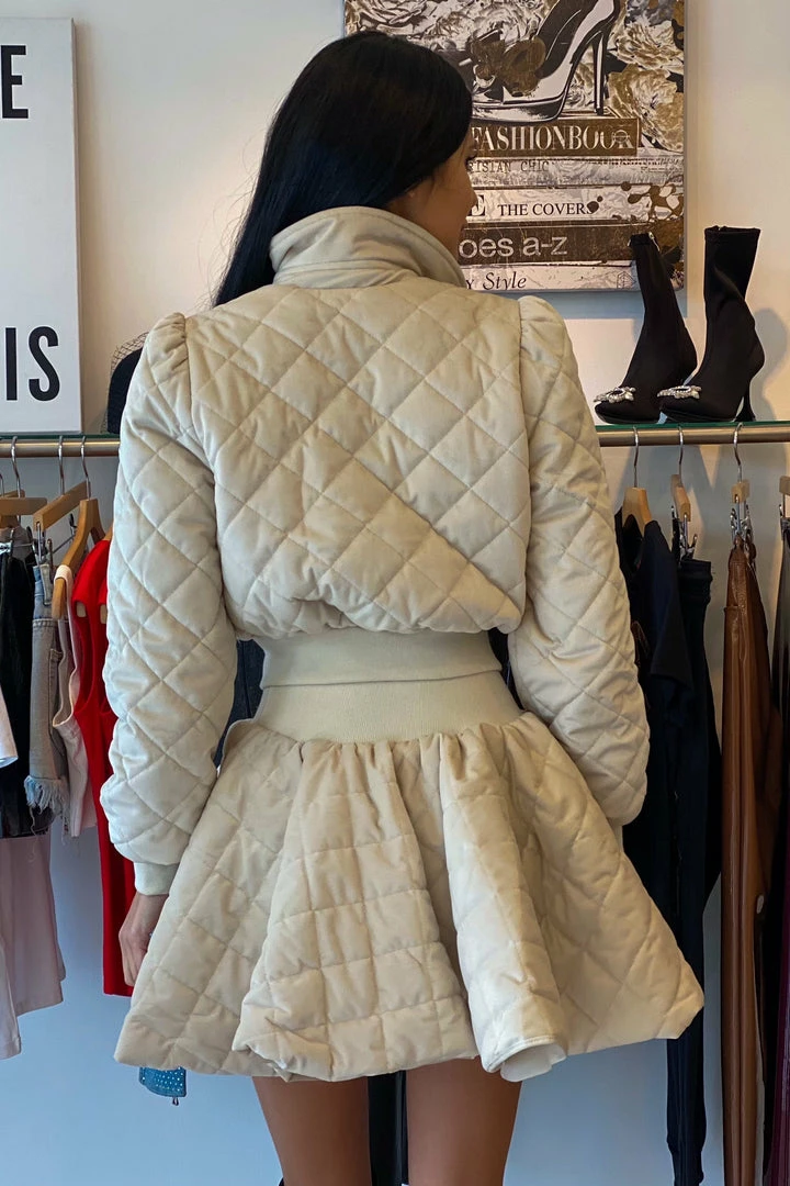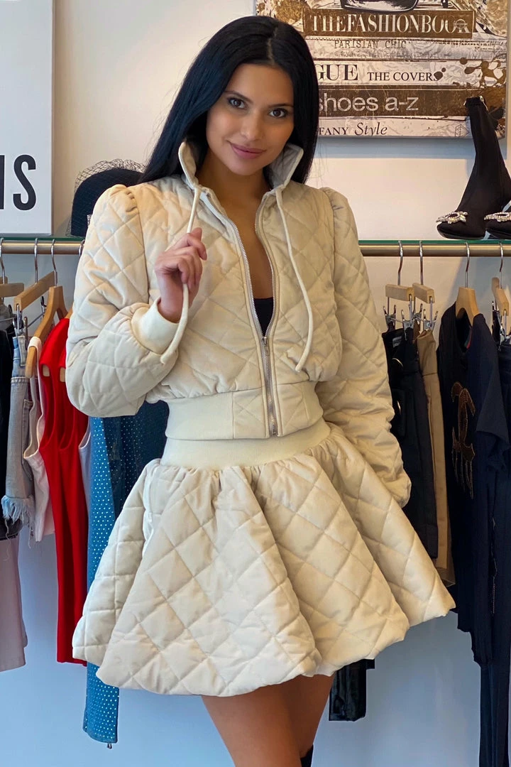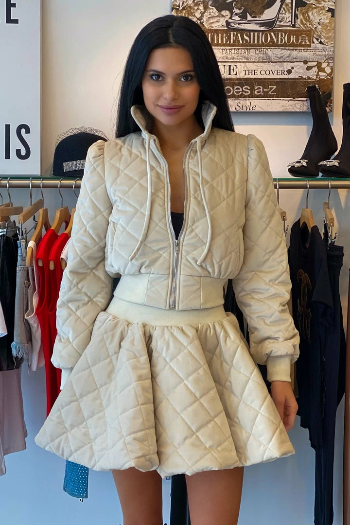 We are loving this two piece set to earn you some style points doll! Featuring a quilted fabric jacket and matching mini skirt, what’s not to love? Team this with the knee high boots for a look that’s totally on-trend.