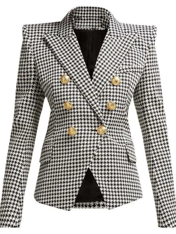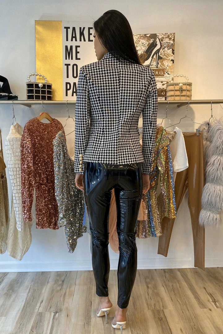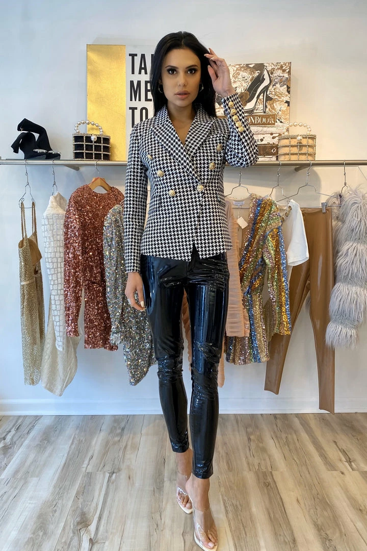Ready to amp up your OOTD? Pair our ‘Donatella’ blazer on top of your look to add some serious chic vibes. Featuring a houndstooth pattern, double breasted style, and gold button embellishments.