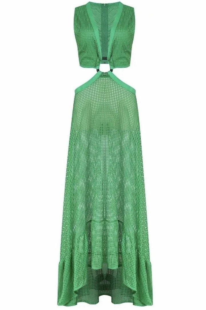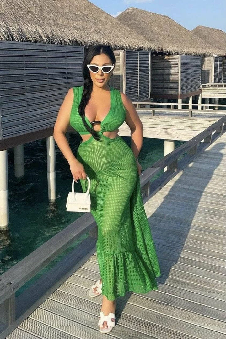 Slip into something sexy on your next getaway with the ‘Donte’ maxi! Featuring a gorgeous green color, cut outs around the waist, center ring detail, deep v neck, and a maxi length.