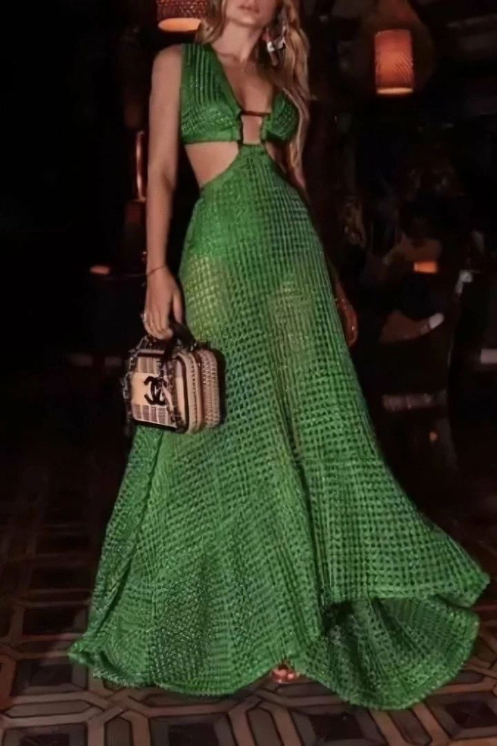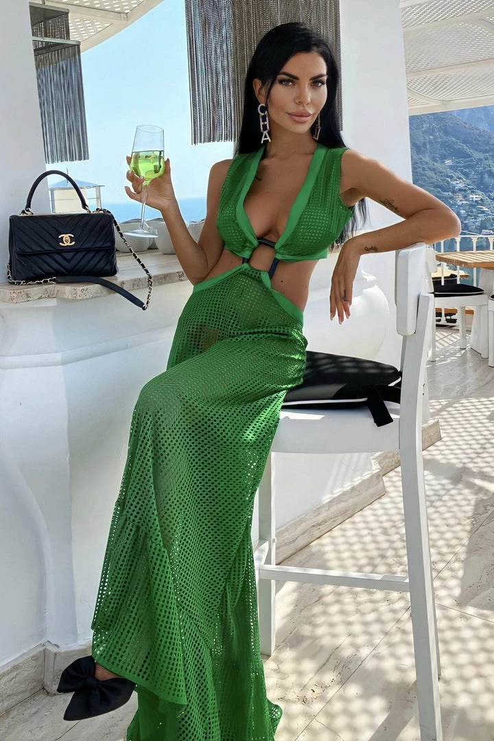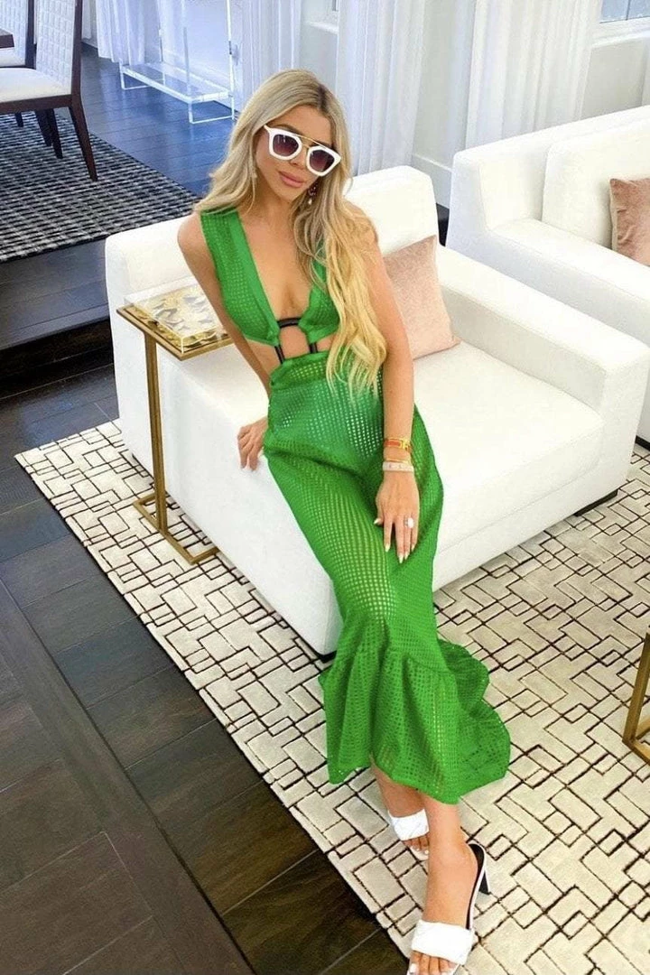 Slip into something sexy on your next getaway with the ‘Donte’ maxi! Featuring a gorgeous green color, cut outs around the waist, center ring detail, deep v neck, and a maxi length.