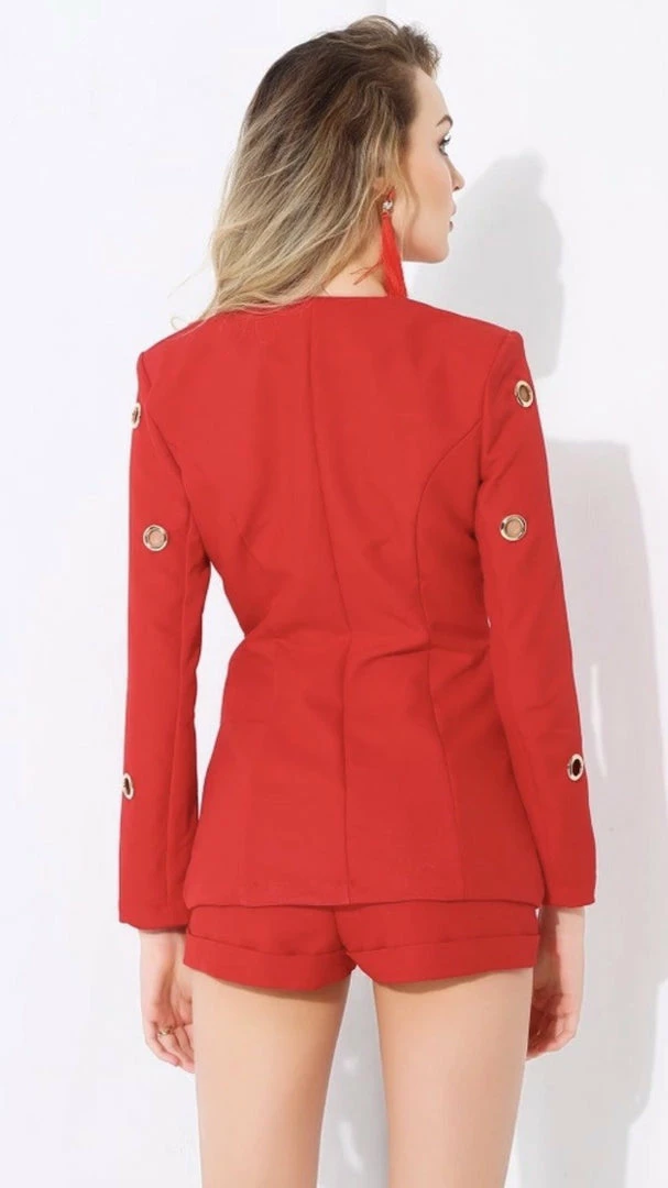 The perfect ensemble for any date night, brunch, or special occasion. Featuring a grommet detailed blazer and matching shorts. Pair this set with tousled waves and ankle strap heels for a sexy look.