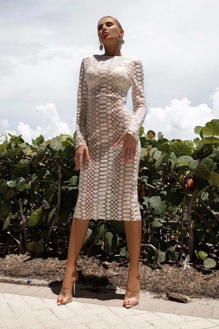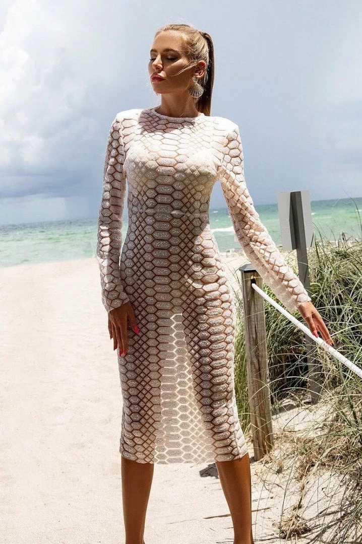 Look sexy and stylish in this stunning piece. This dress features long sleeves, sheer and glitter material, and midi length.
