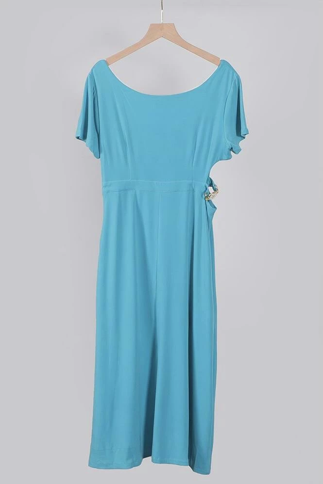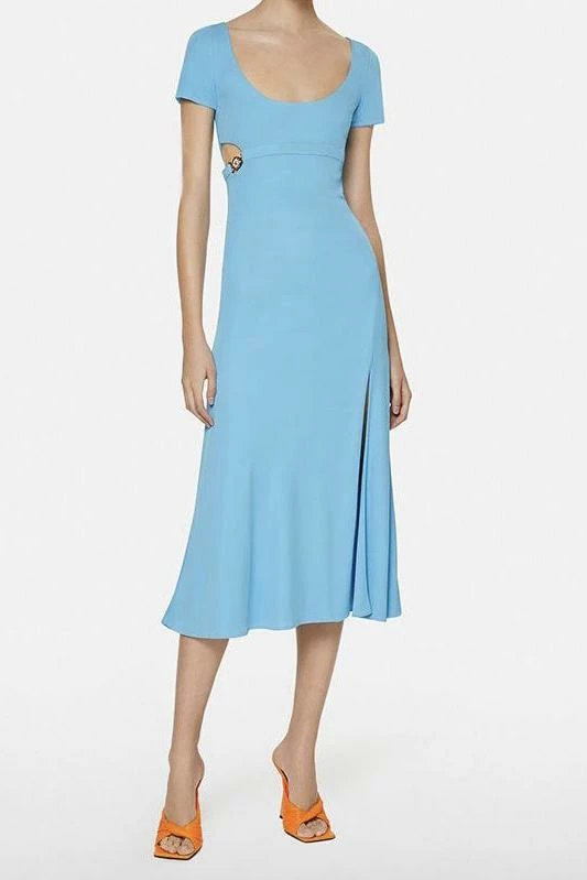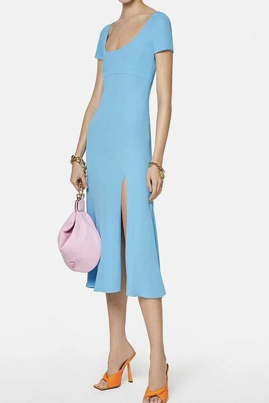 This dress will have you looking like a daytime doll! Featuring a short sleeve, oval neck, split leg midi dress. Pair with heels and a trench coat for a outfit that screams daytime chic.