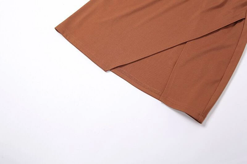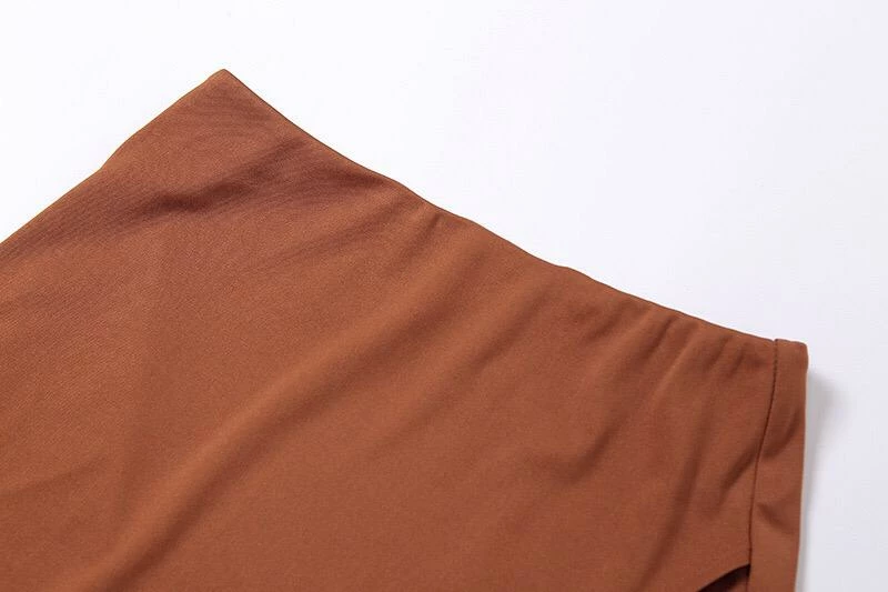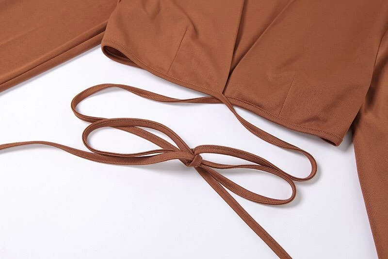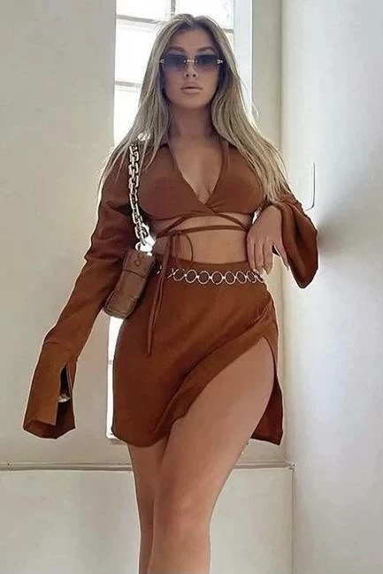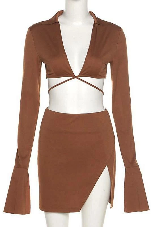 Featuring a long sleeve, split sleeve top with a long front tie and a matching high waisted mini skirt with a leg split. Perfect for a summer beach party paired with strappy heels.