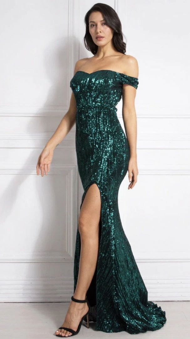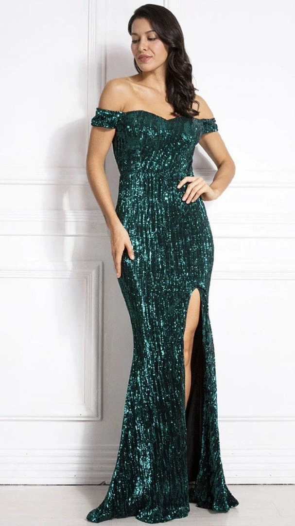 Land yourself on the best-dressed list with our ultra glamorous ‘Elijah’ gown. Featuring an off the shoulder style, sparkling sequins all over, leg slit, and floor-length.