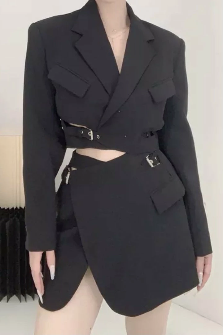 There’s nothing more we love than a fresh set dolls. Featuring a cropped, long sleeve blazer with a crossover buckle design and a matching crossover buckle mini skirt. Pair perfect with silver, layered neckalces and a slingback heel for a classy look.