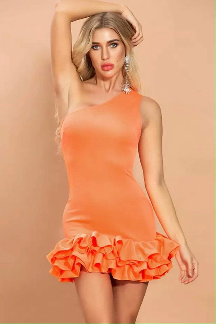 This gorgeous number features a one shoulder style, ruffle trim, bodycon fit, and a mini length. Pair with stilettos and a mini handbag.