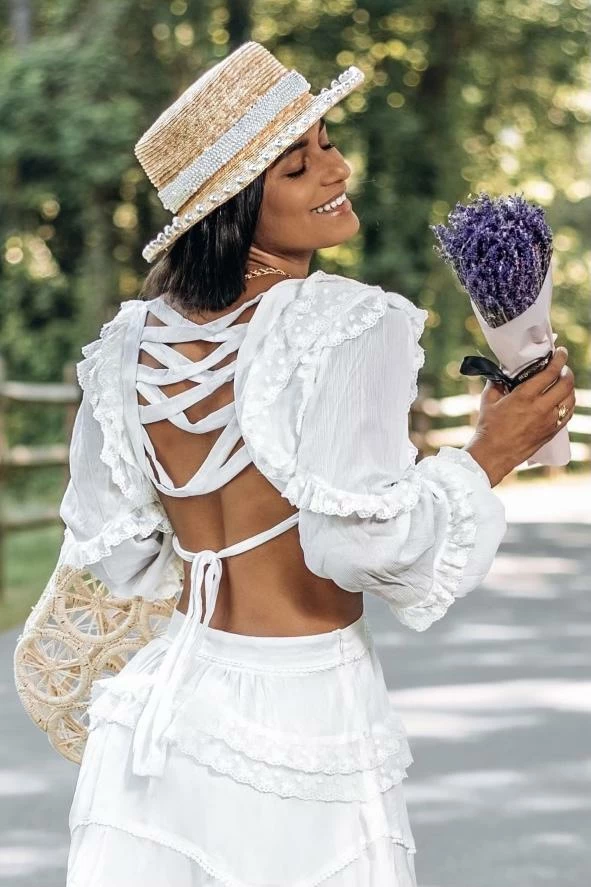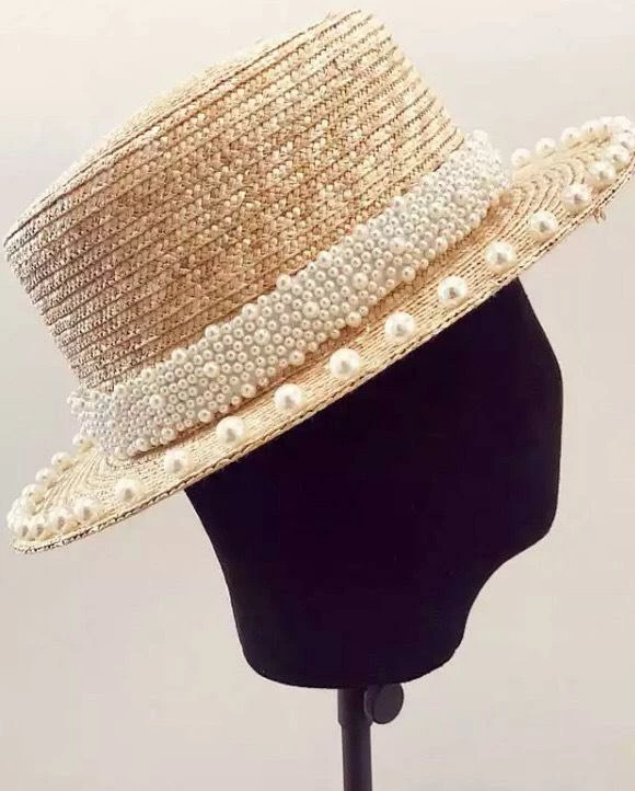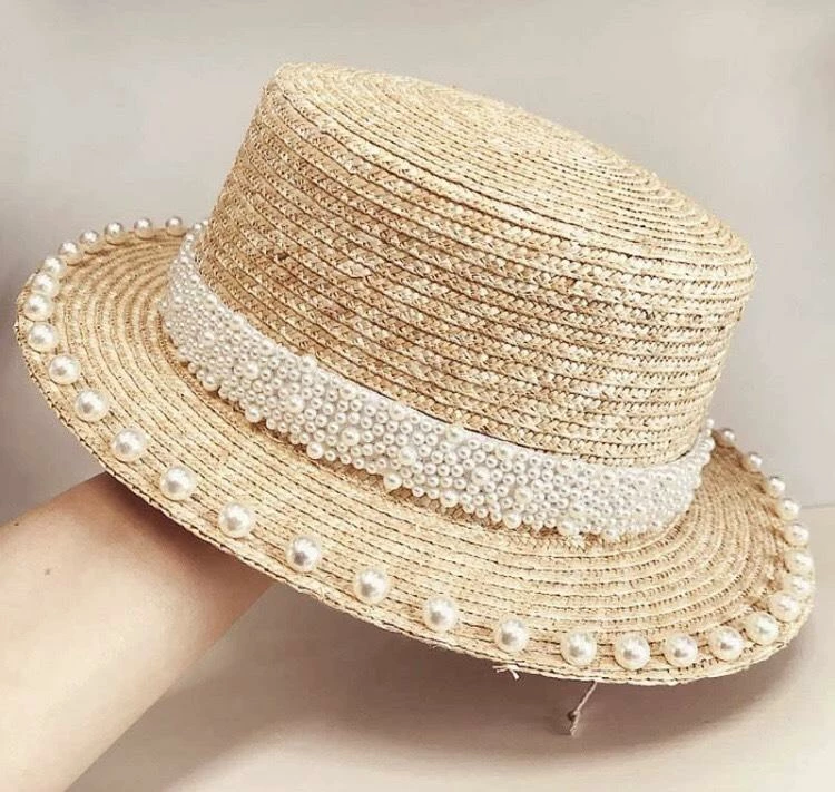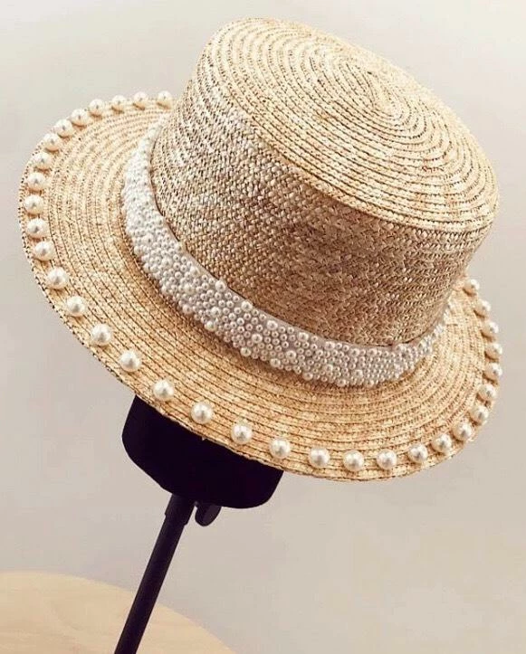 The ‘Evie’ hat includes a short brim style hat, pearl embellishments, and straw material.
