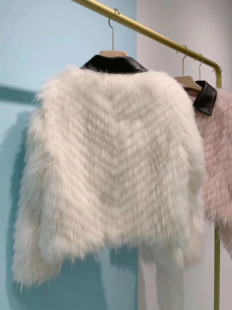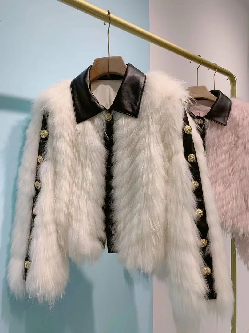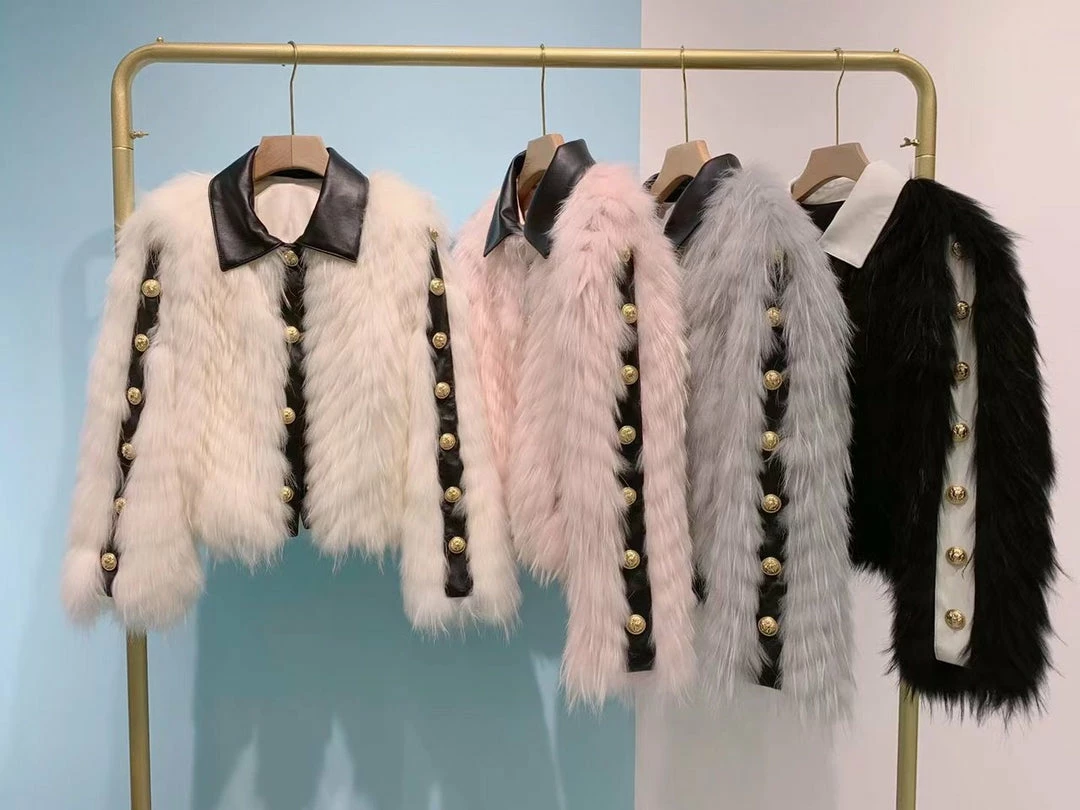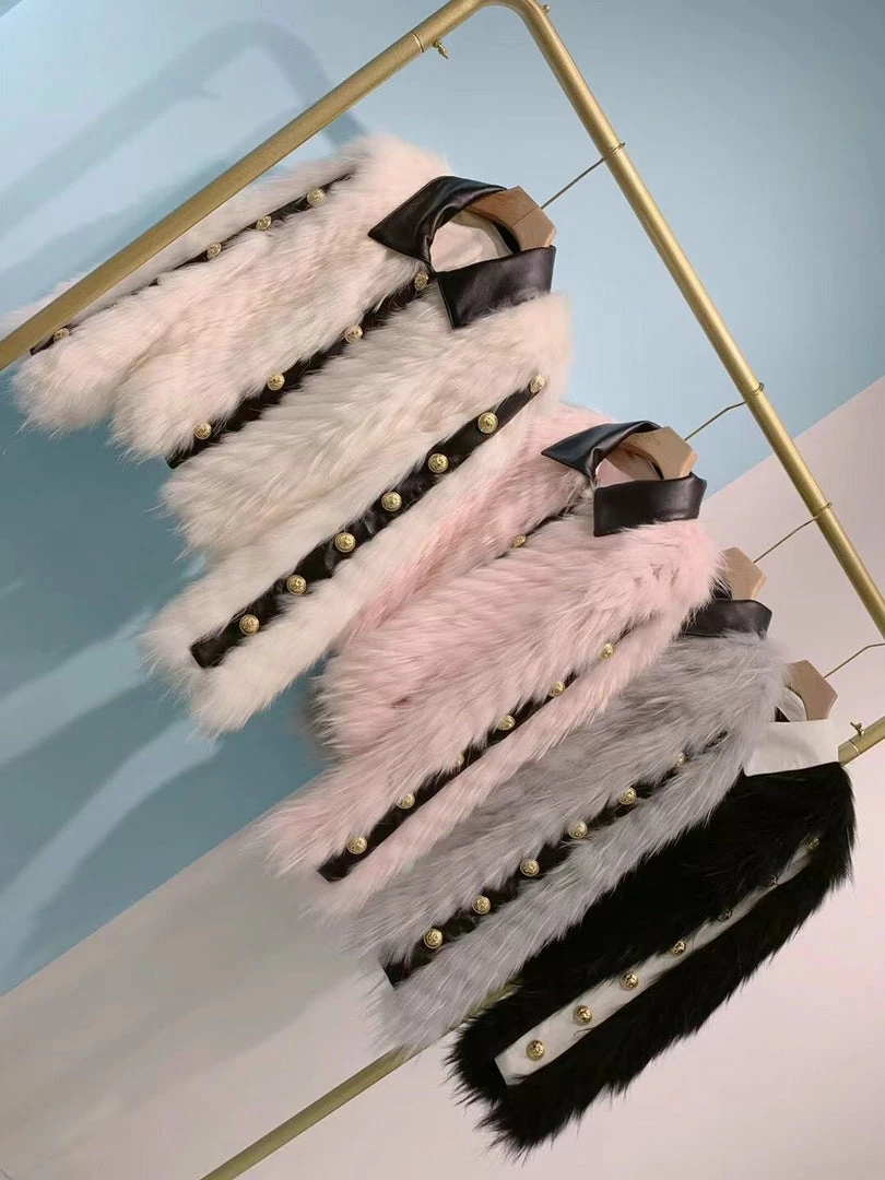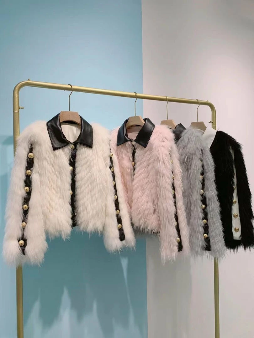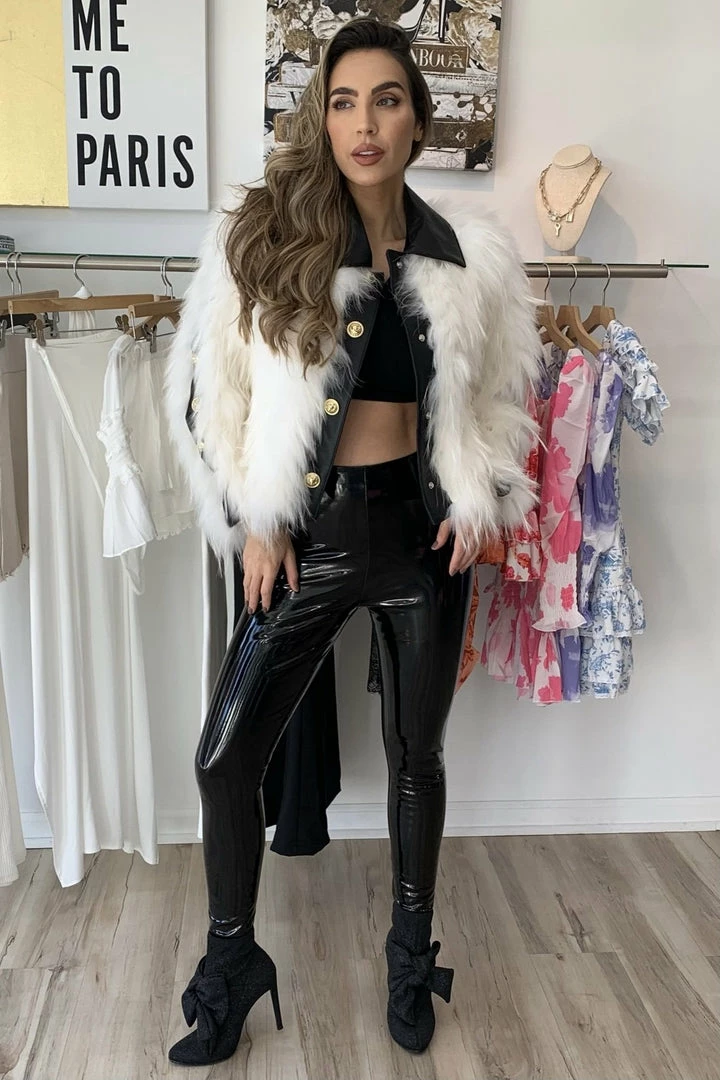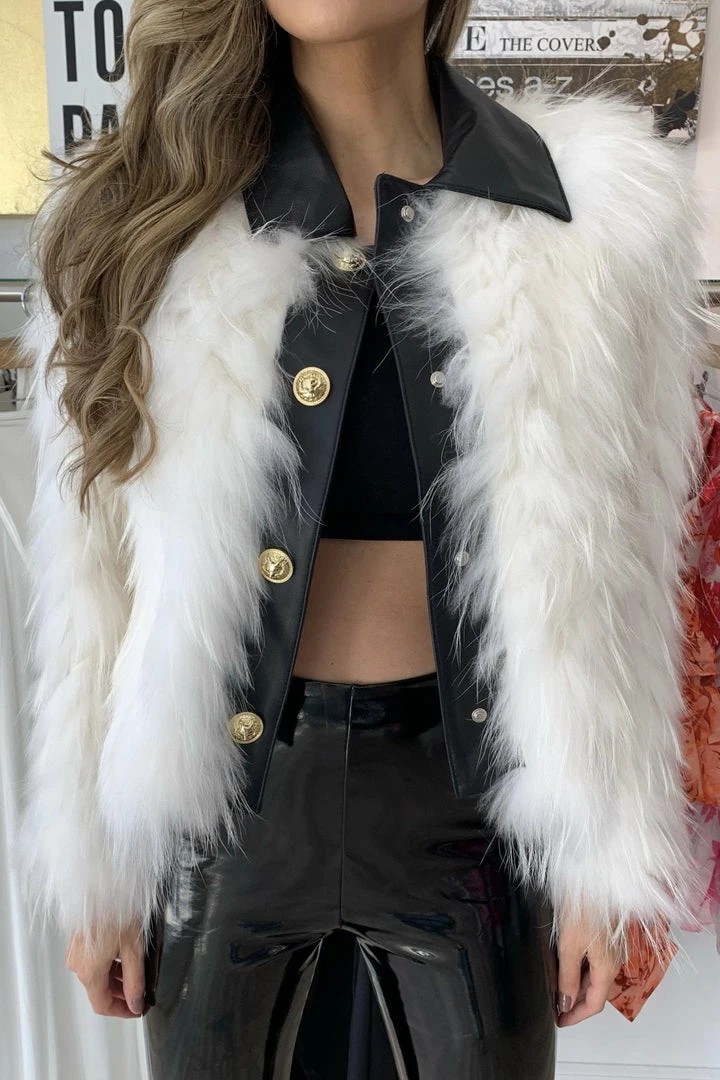 Stay warm all season long in this fur coat with black leather and gold button detailing along the arms and center enclosure. This coat will have you instantly chic with any outfit and event.