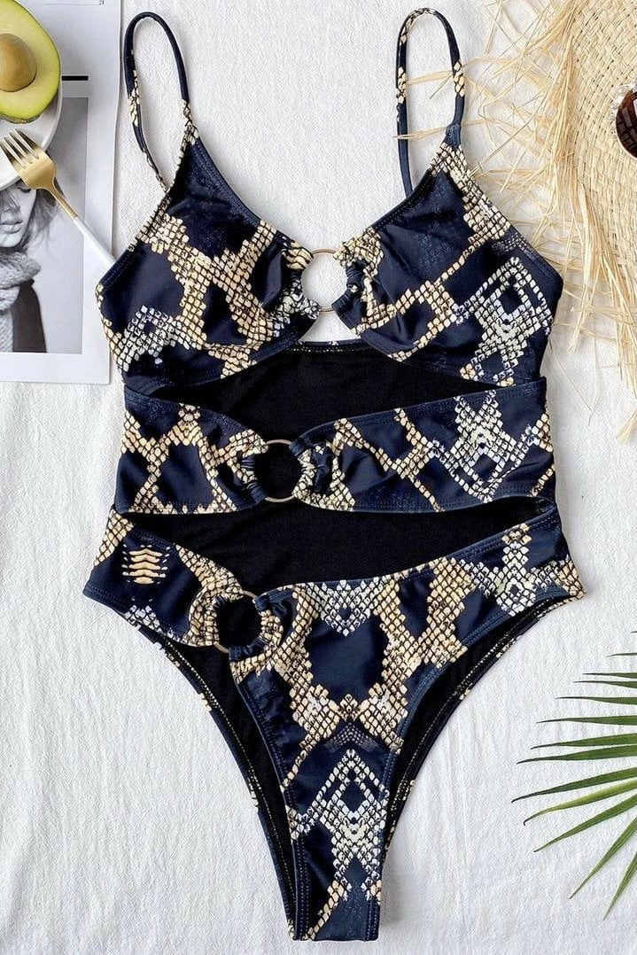 Show off your summer body in this one of a kind swimsuit. Featuring a snakeskin design, cut out front with metal rings, a cheeky back, and thin straps. Wrap a shall around your waist with big sunglasses to complete this sexy beachy look!