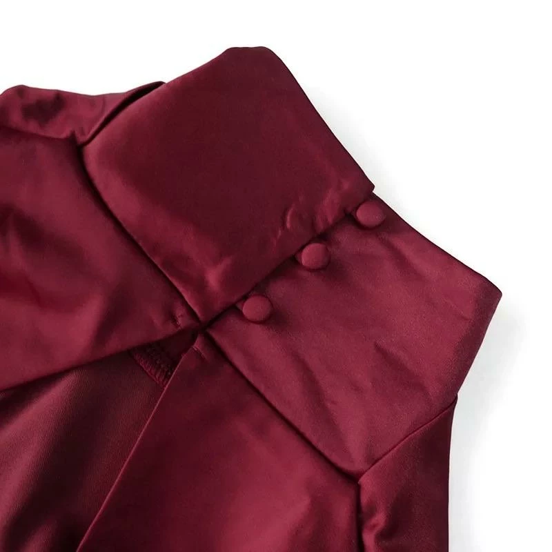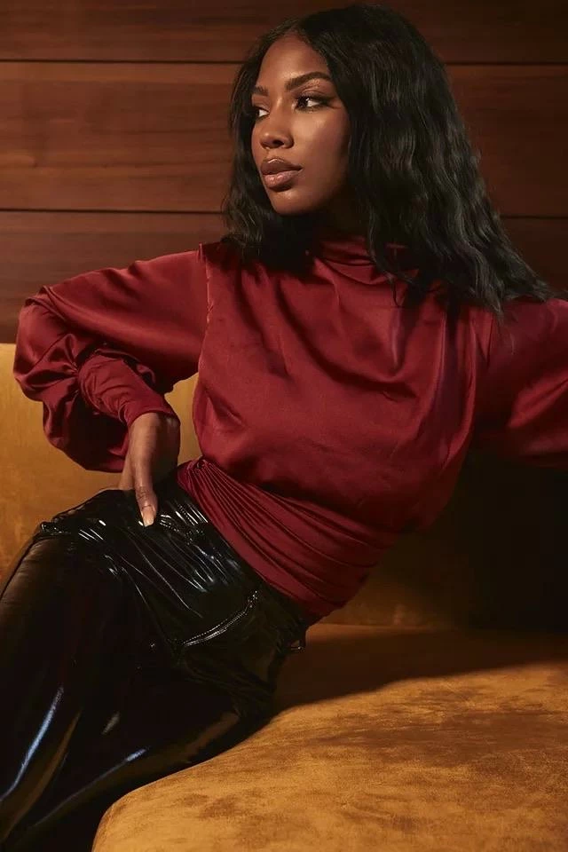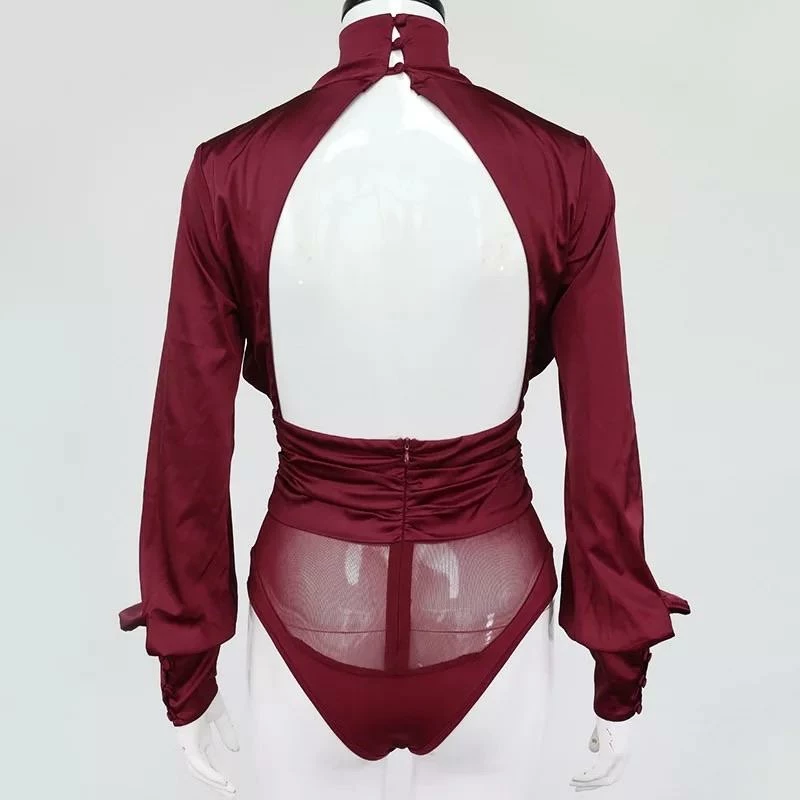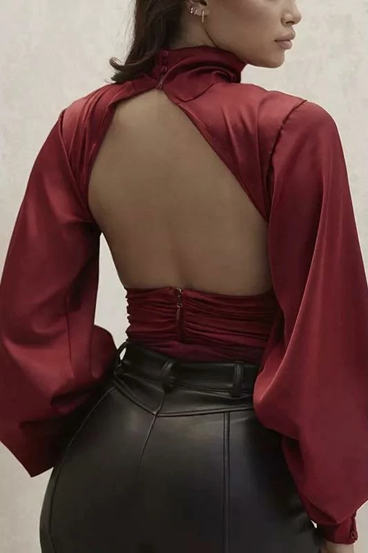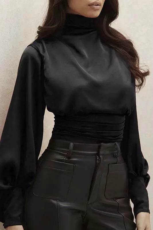 This glamorous satin bodysuit features a high collar, lantern sleeves, ruched detailing, and a black less design with button fastenings. Pair this with leather jeans and a pony tail for a sleek look.